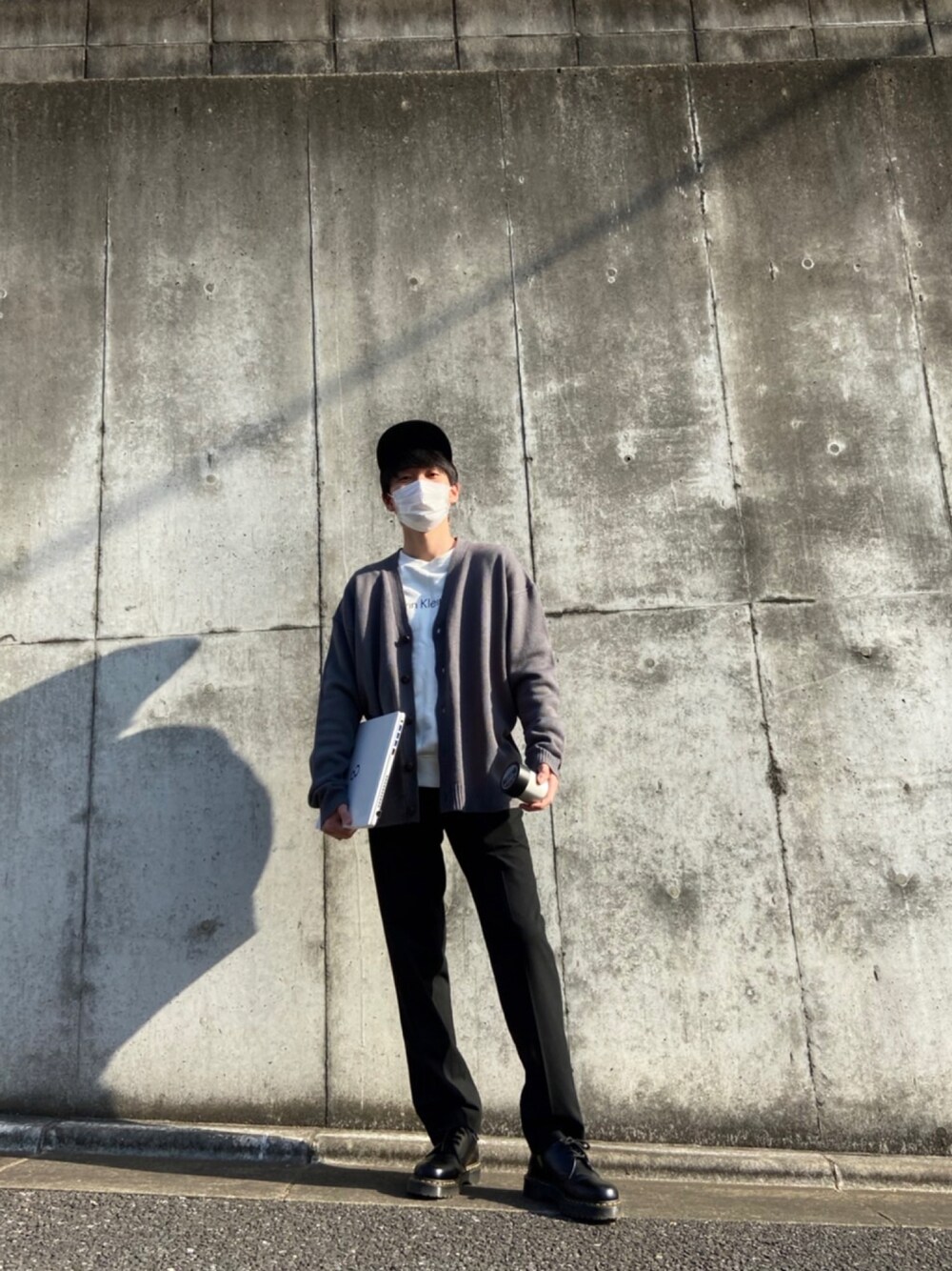 カーディガンを使ったコーデ。 右手にPC、左手にフレグランス。