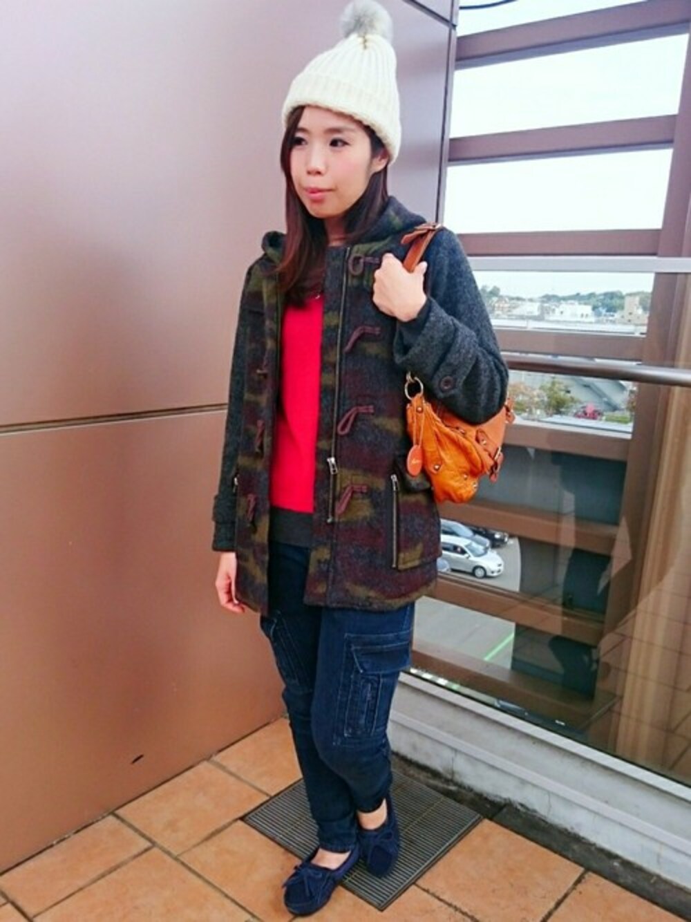 ダッフルコートの色が迷彩色って珍しいです☆差し色に赤のニットで合わせました♪デニムカーゴのパンツも履きやすくておすすめですょ☆