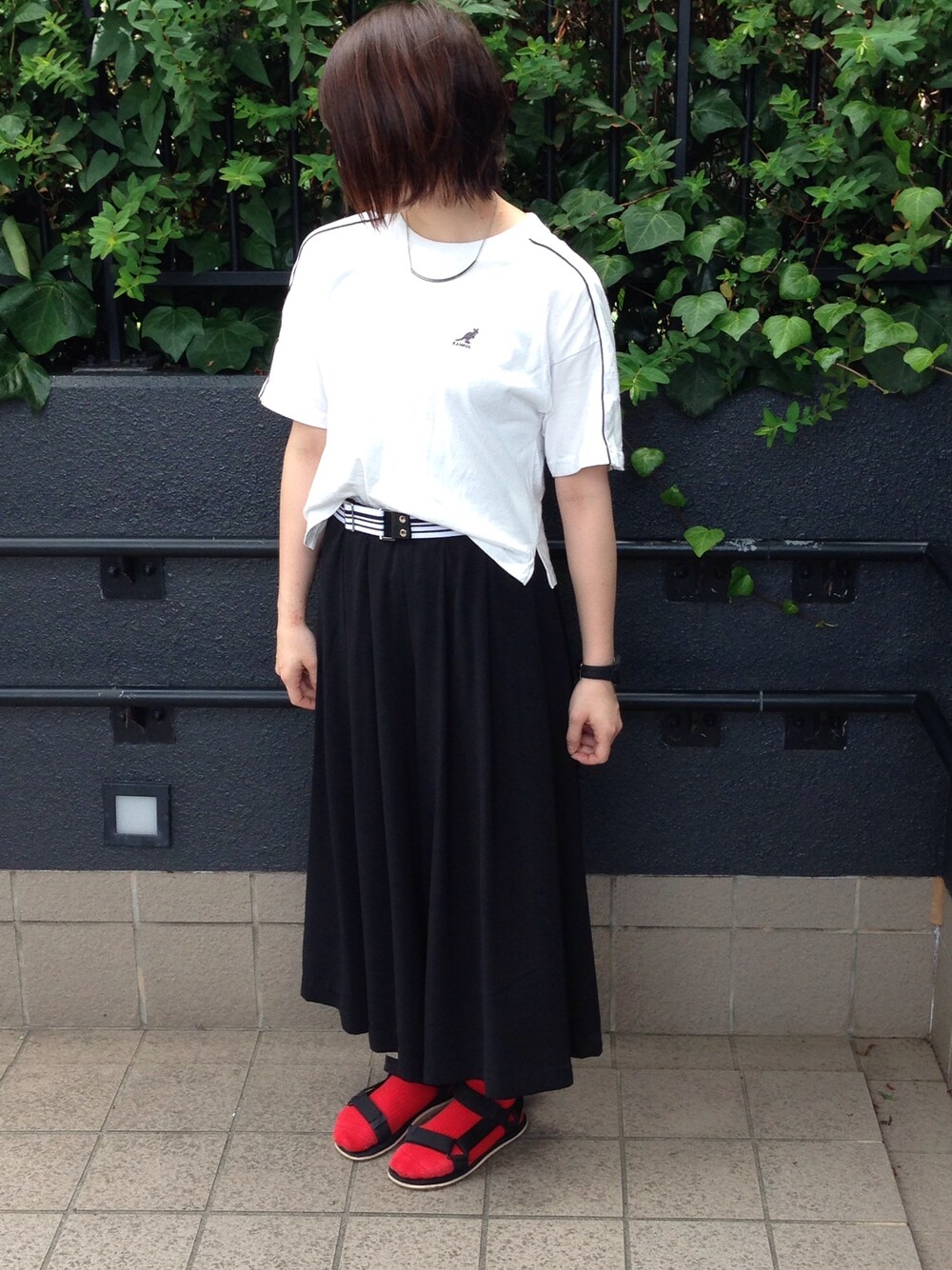 全体をモノトーンカラーでまとめ、差し色にレッドを使いました。 モードな中にも、リラックス感のあるフォルムのKANGOLTシャツにスポーツサンダルでスポーティな要素を取り入れたスタイリングです。