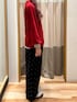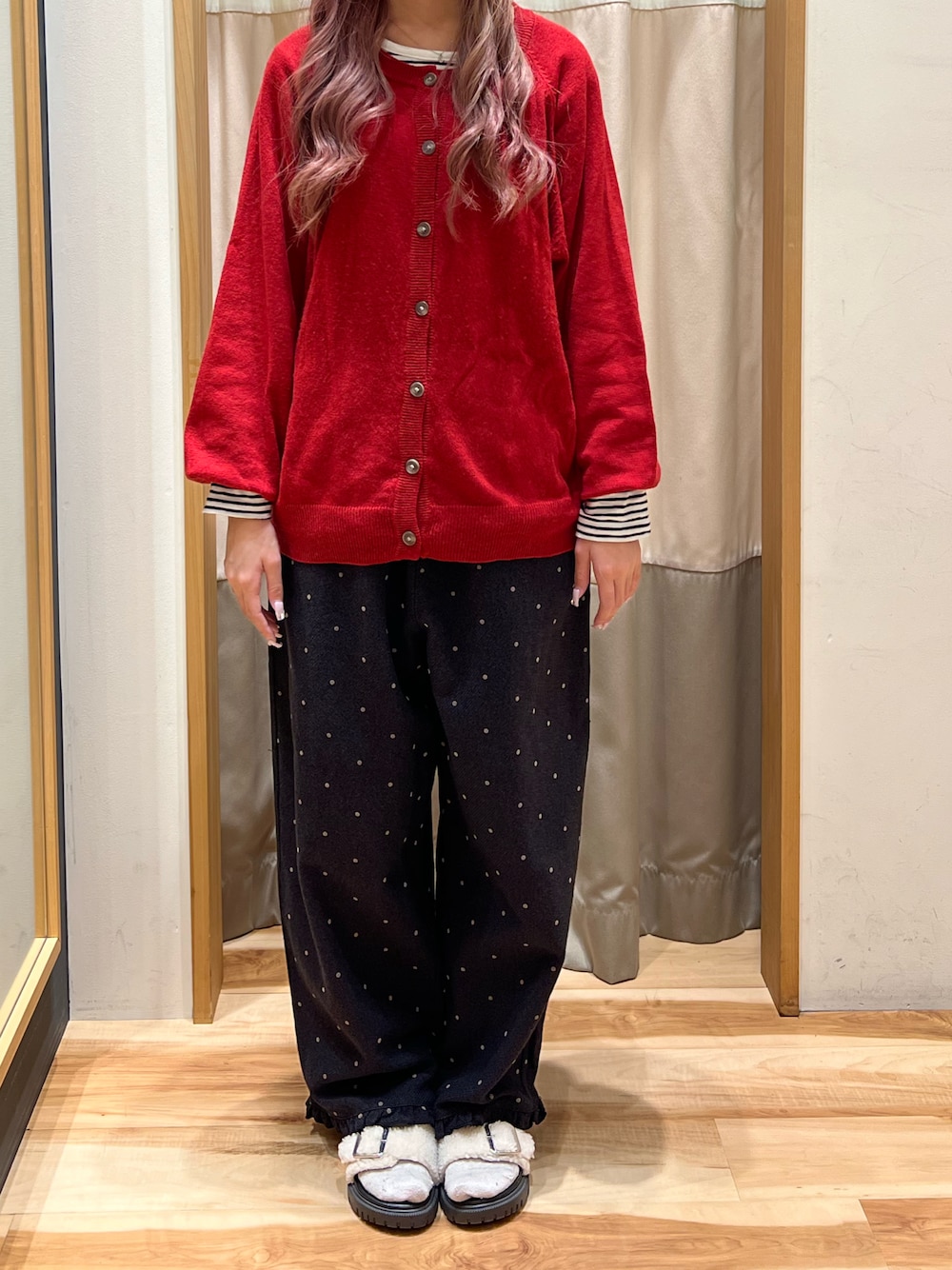 秋っぽく、カーディガンは明るめの赤色を取り入れ、パンツはドット柄の暗めのパンツと合わせて着ました!