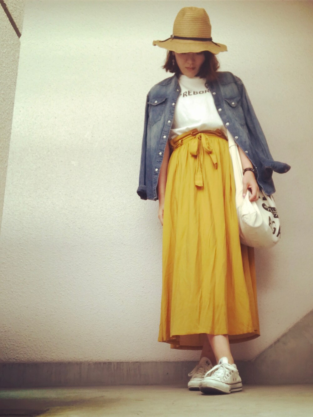 イエロースカートの着回しコーデ♥️ そろそろハットが必需品です👒