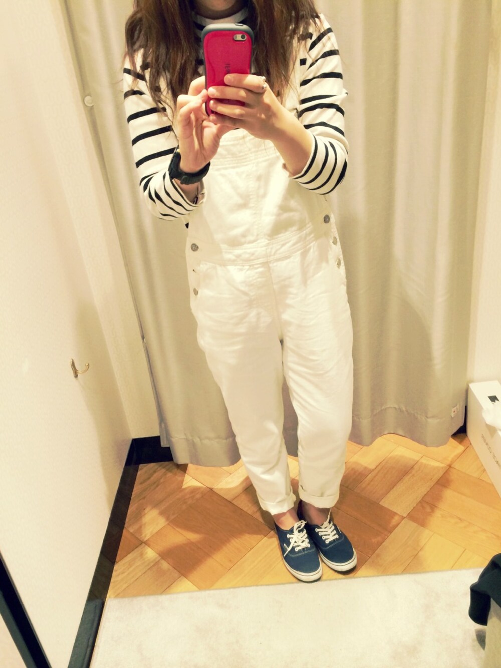届きたてのオーバーオール! 生地も軽くて動きやすい! 春はホワイトの服に 目がいくな〜〜( ̄ー ̄)♡