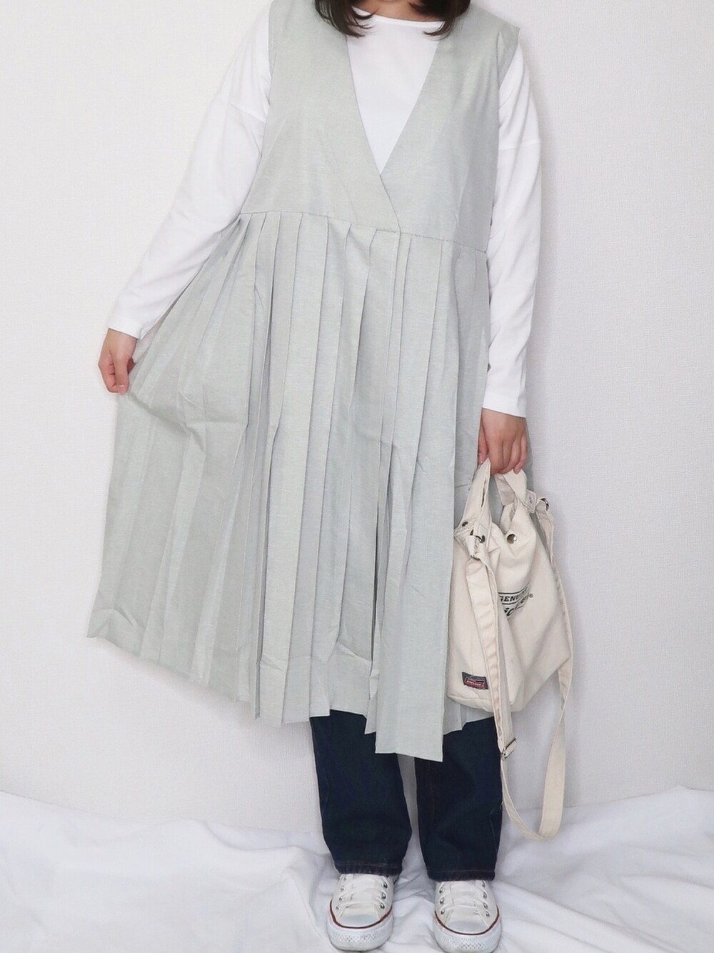 前開きワンピースが春カラーでお気に入り! デニムをチラ見せでカジュアルにできて着やすい!