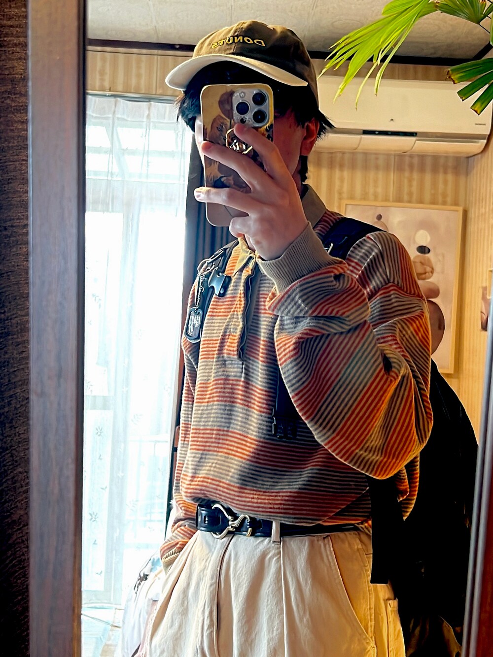 セカスト調達長袖ポロのタックインコーデ ・パンツ・キャップはニコアンドで調達 →パンツはレディースにありました。 ・ベルトはバックルが変わった形で金なのが可愛い... ・室内で撮ったので下は写ってないですが、スニーカーでもローファーでもなんでも合うと思いますよ(適当 一応買い物行く設定