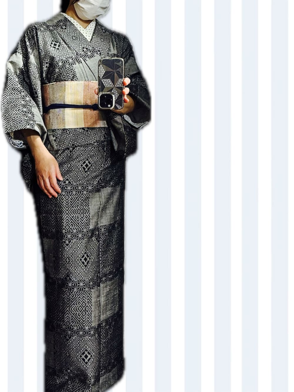 着物 紬 襦袢袖自作 半襦袢袖 筒袖 半幅帯 正絹  文庫結びが出来るようになった。 お腹周りの紐を減らしたい。
