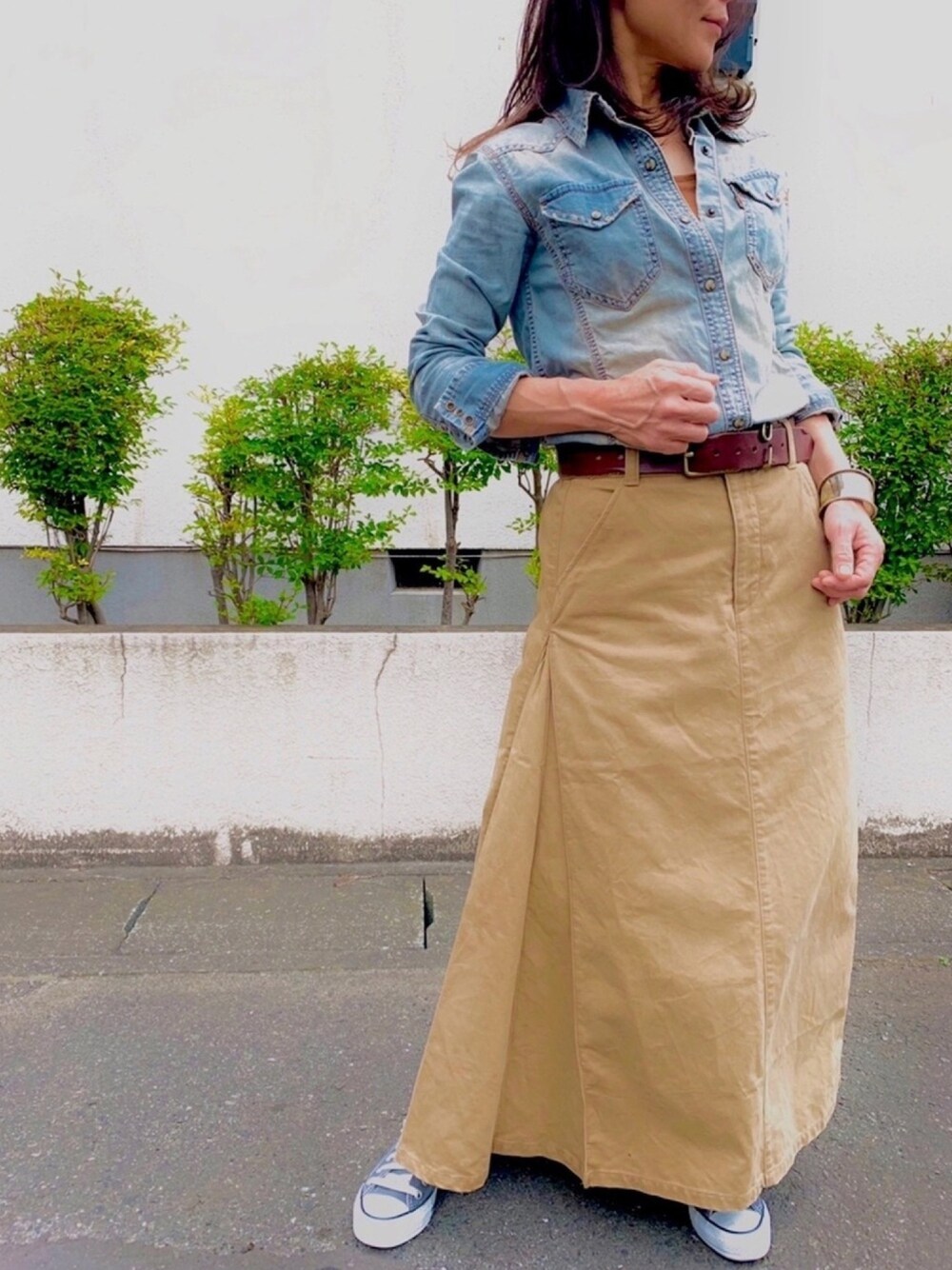 デニシャツとチノスカの鉄板コーデ☆ 最近家にいる時間が増えて、ジワジワと体重が…😱😱😱💦 プランクとドローイン、また始めなくちゃ💦