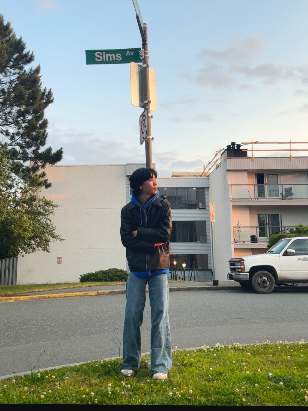 友達からもらったブランド不明のブルーのフーディーにH&Mのフェイクレザージャケットをレイヤード デニムはH&Mのフレアデニムのレディースです。 海外の田舎だとあまり高い服を着てると目立っちゃいますね。