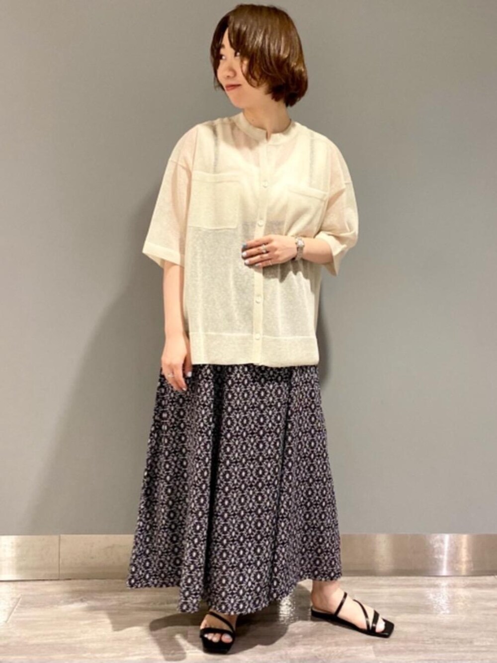 【身長153cm】シアーのカーディガンにサロペットスカートを合わせ、夏らしく涼しげな印象にしました。
