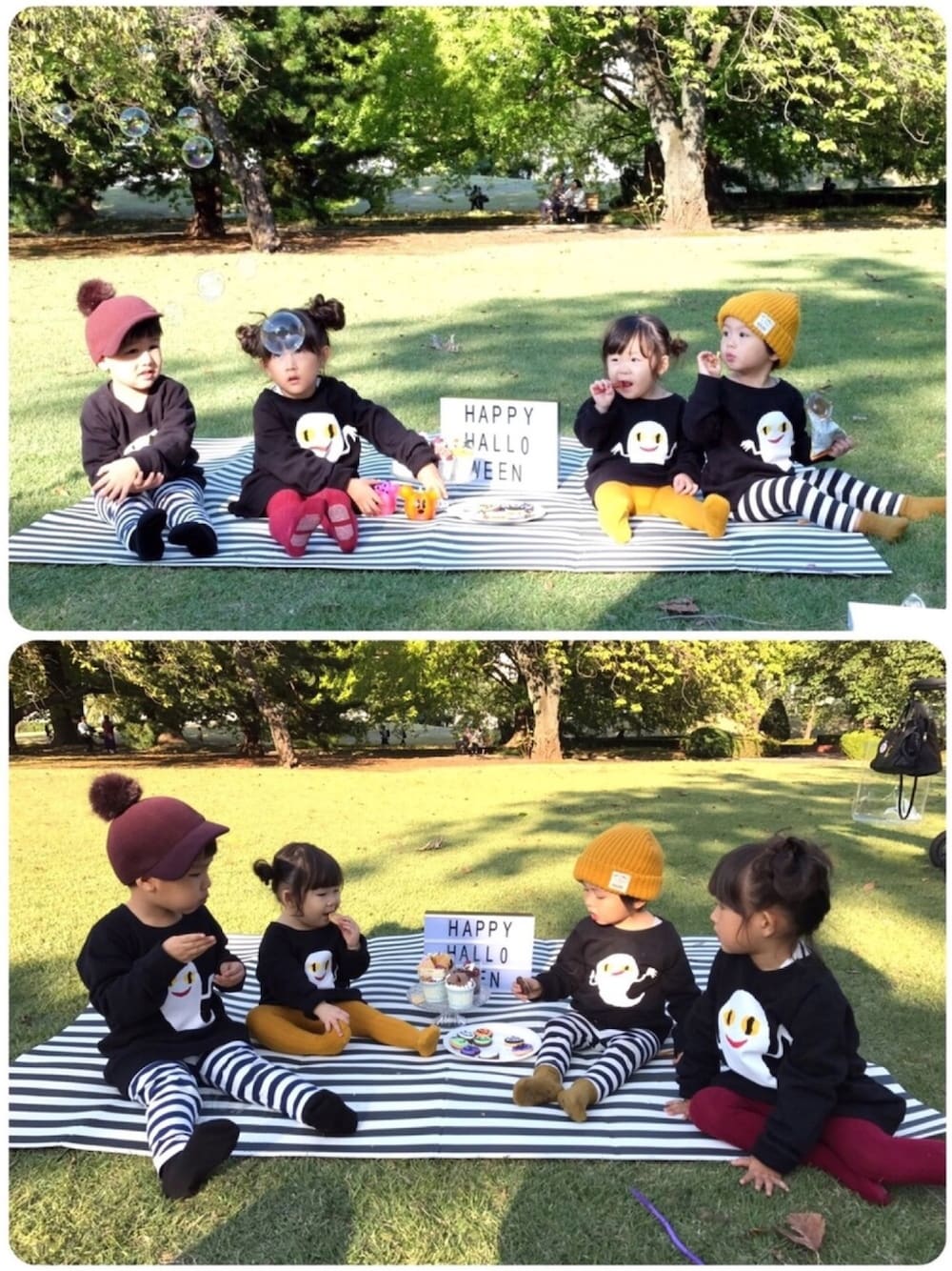 おはようございます😃☀ 〜WEAR HALLOWEEN 2017〜 なコーデ。 WEARの大好きなお友達たちとハロウィンピクニックをしてきました👻💓👻 コーデはもちろんリンクコーデで💓❤️💓 4人のリンクはSPACEのねないこだれだトレーナー👻💕 ーー 3さいペアはあずき❤️ 1さいペアはからし💛 ーー 男の子はボーダーレギンス&帽子😈 女の子はカラータイツ&ツノヘア😈 ーー で合わせてみました😍💕 はじめましてなカイくん&ヒナコちゃん😍💕 みんなpicだと大人っぽくみえるけど、やっぱり会うと小ちゃかった🙈💓 そしてその2人より小さいめいきさww ヒナコちゃんはお姉さんって感じでお世話してくれたり心配してくれたりで可愛くって〜😍💓 カイくんは元気なお兄ちゃんって感じで、大きな葉っぱや枝持って走ってててカッコよかった〜😍💓 めいきさはシャボン玉に翻弄されてました😂💓 可愛い4人と優しいママたちに癒されまくりの1日でした😍💕 ヒナコちゃん💓マナちゃん カイくん💓エリちゃん メイちゃん💓アイちゃん ホントにホントにありがとうー!また遊ぼーね❤️❤️❤️