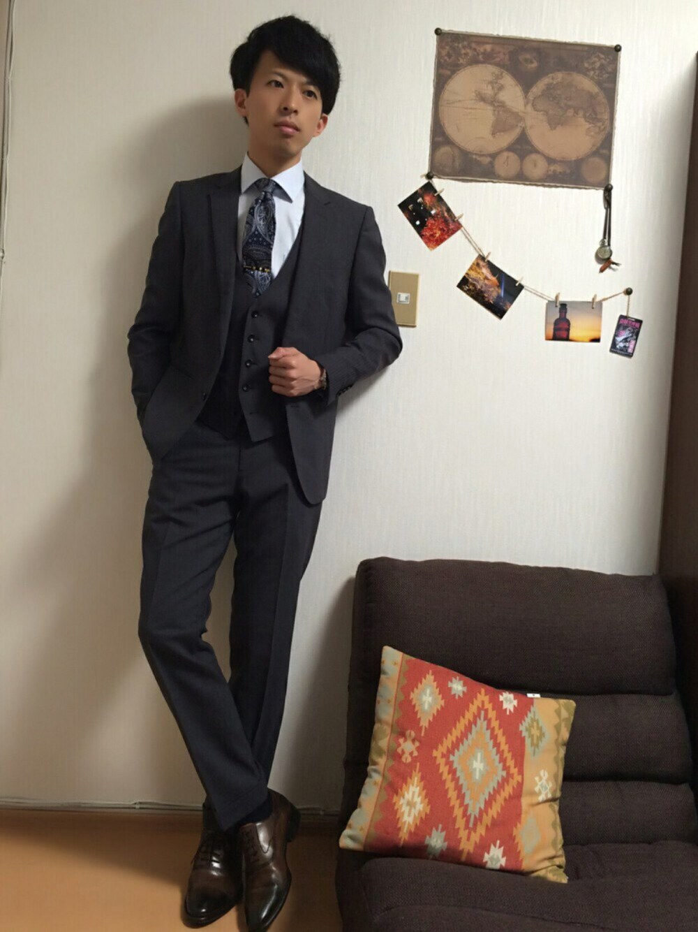おはようございます(^^) 今日も暖かいですね(^o^) 昨日と連続でスーツスタイルを上げてますが私服のバリエーション無くなった訳ちゃいますよ(震え声) 今日で最後の土曜出勤です! 次の仕事は土日休みなので笑 気合い入れていきます(^^) スリーピースはこの時期に最適やね! グレーのスーツ着るとできる男っぽくなって好きです笑 とりあえずペイズリー柄のネクタイと シャツの色合わせればおしゃれに見えます(*^^*)