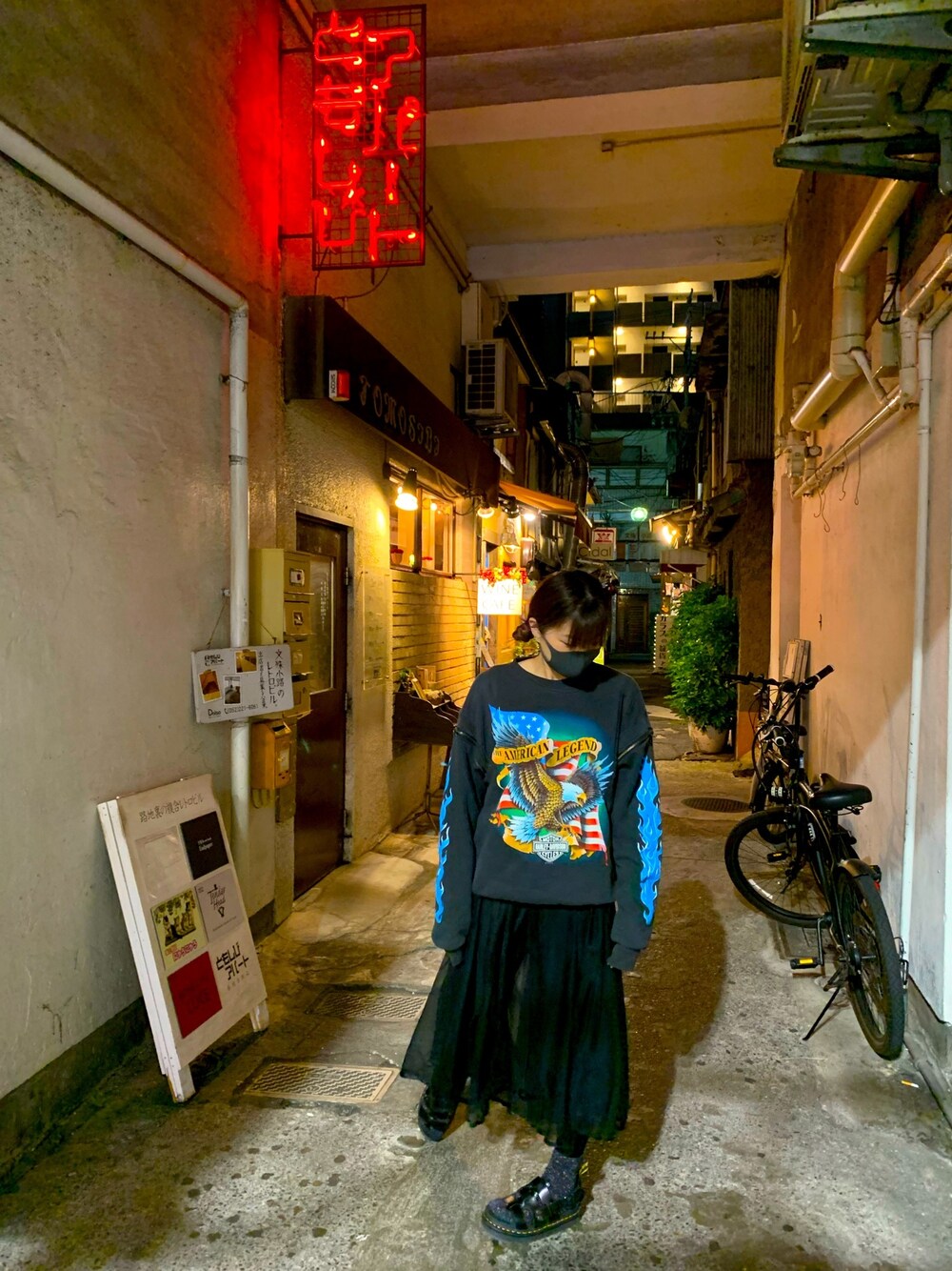 ハーレーのスウェットは自分でリメイクして腕の部分が取り外しが出来ます。 取り外して着るとインナーが見えてまた違った感じで着られるので好きです○° 中のスカートはラグジュアリーワンピースを着てインナーパンツは黒スパッツでスポーティにしています○°
