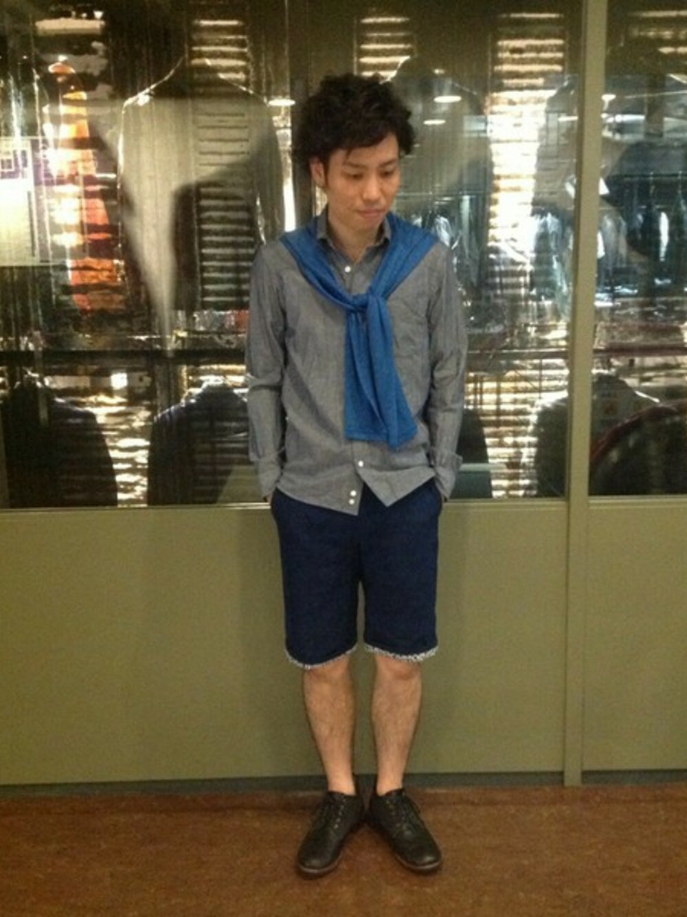 薄手の長袖シャツに、ショーツを合わせ梅雨対策。 ショーツには、花柄のジャガード素材を使用しておりネイビーはインディゴ染色しています。 また、同素材でベストもございます。