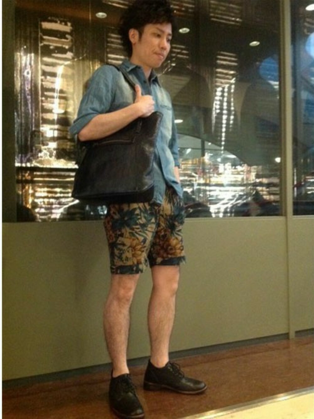 インパクトのある大柄のフラワープリントを施したワーク調のショーツに、デニムシャツをあわせた飽きのこないスタイルです♪