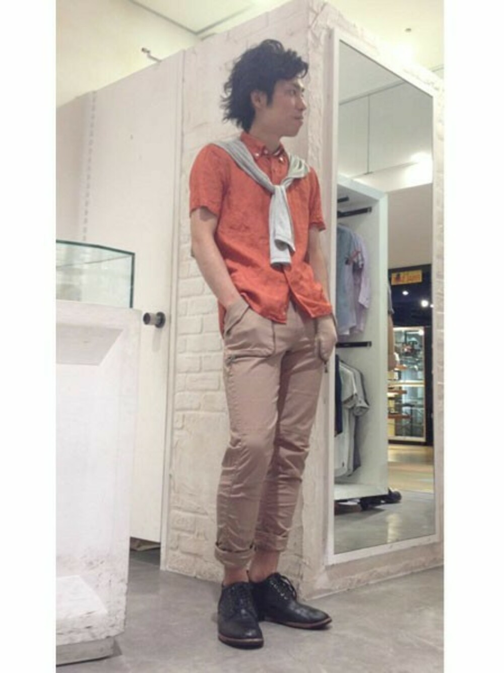 オレンジカラーをアクセントにしたナチュラルなコーディネート。 カーディガンは、今年流行りのP巻きでアクセントに!