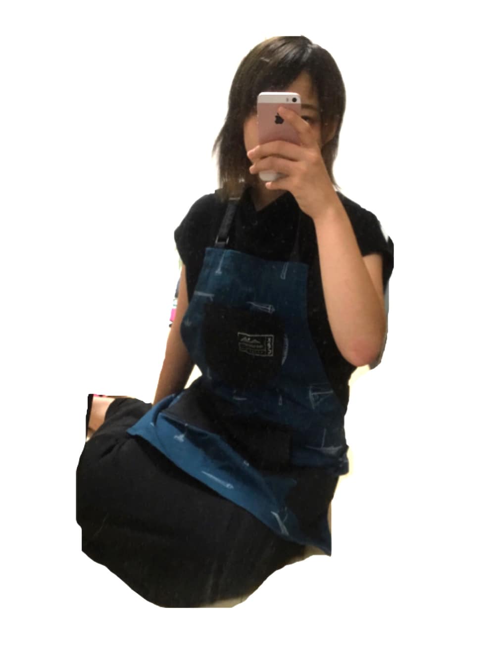 ブラック系のトップス、ブラック系のスカート、ブルー系のエプロンを着用したレディースの夏コーディネートの1枚目の写真