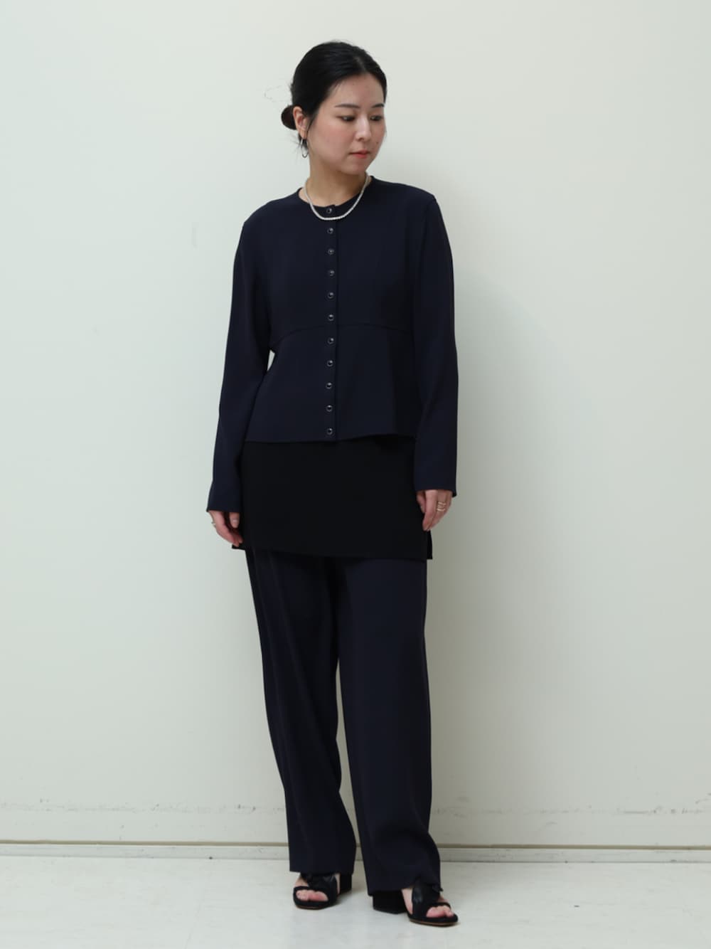 <BACCA>定番のジョーゼットサテンシリーズ。 ミニスカートを付けたパンツは新鮮なシルエットで履くことができます。 シンプルにセットアップで着用しました。