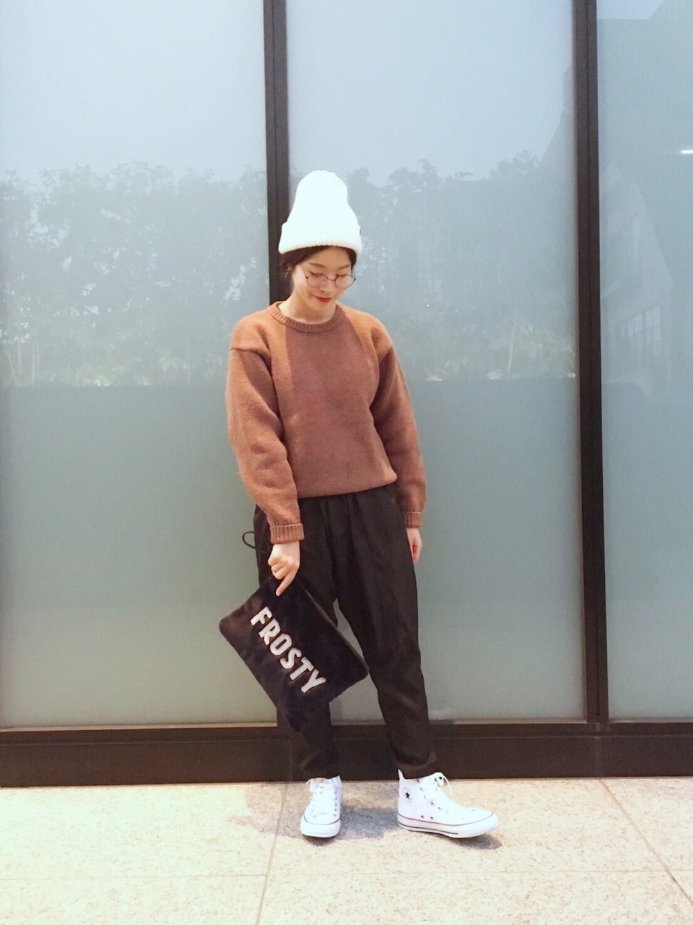 スポーティなロゴがポイントのクラッチバッグをコーディネート❤️ ファーが女性らしいのでガッツリメンズコーデにしてみました(*´꒳`*) ニット帽は8色とカラー展開豊富ですよー!