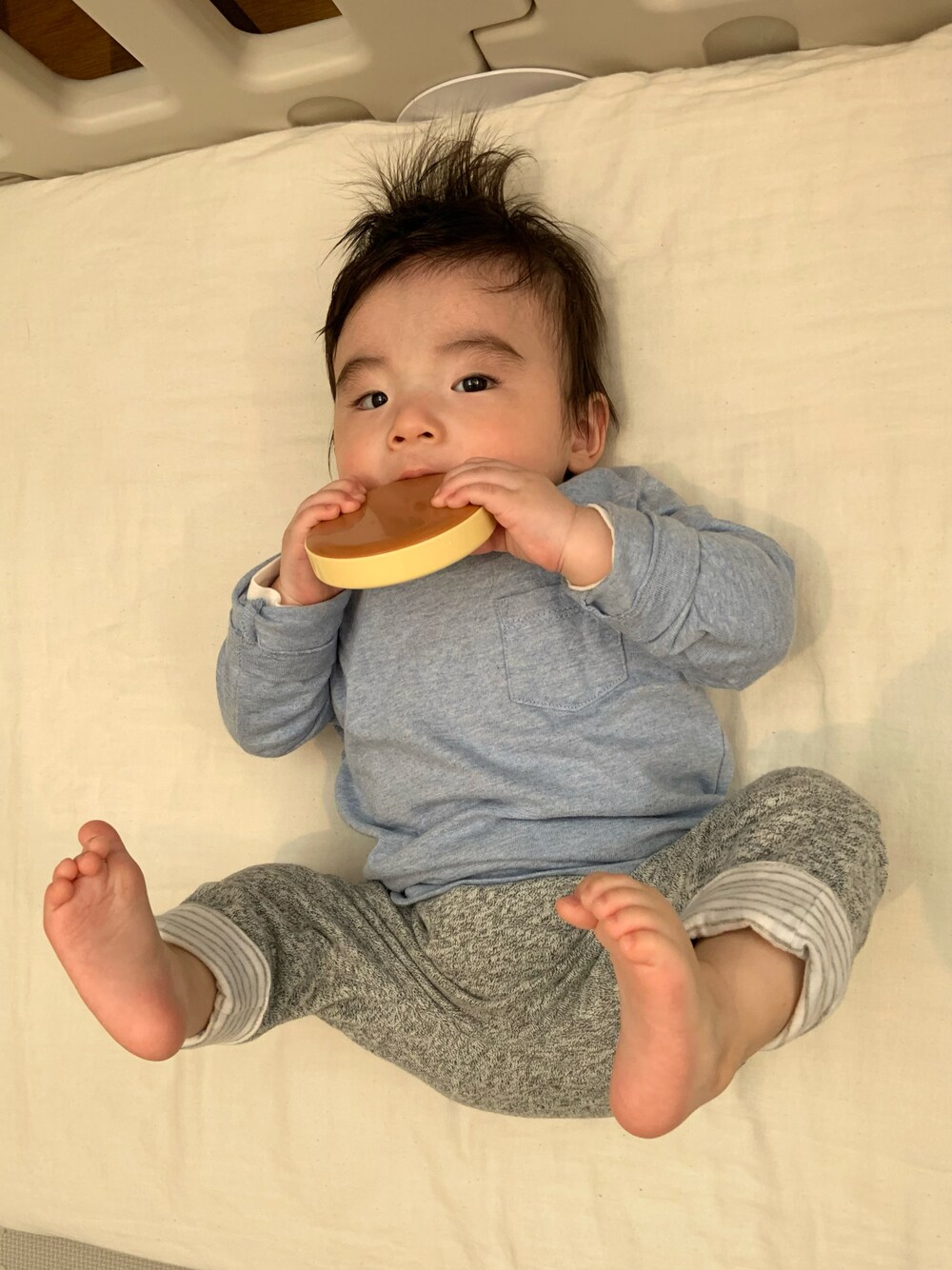 全身GAPコーデ。おもちゃのパンケーキを頬張っています。 2枚目。頭の形が歪でヘルメット治療中。常に被っているので、もはや顔の一部になっています( ・∇・)