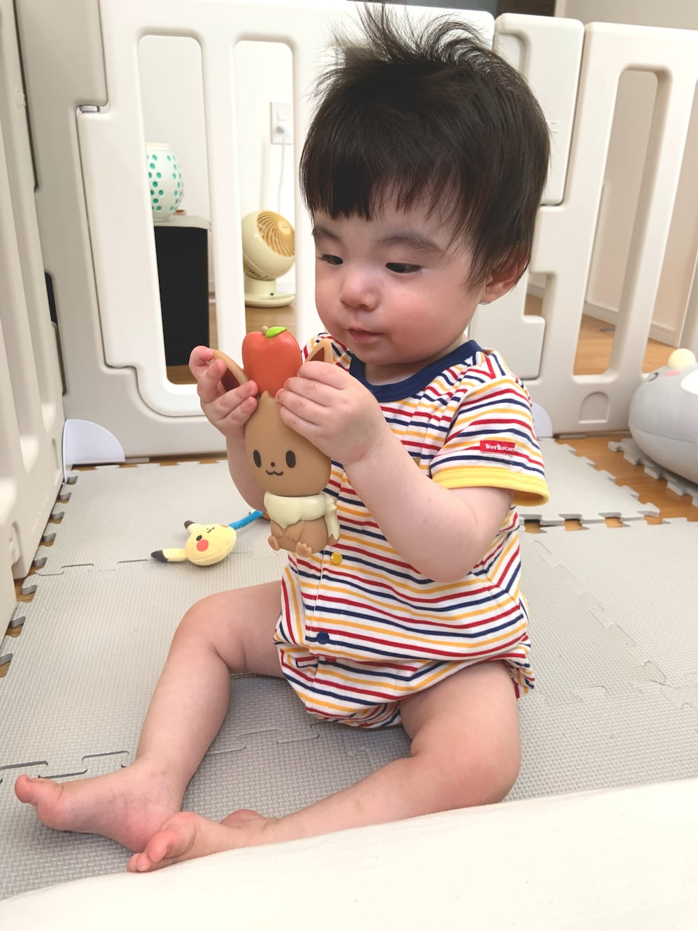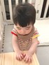 暑すぎて、ロンパース1枚です。ボタンがマーブルチョコみたい。 しかし、この着方であっているのだろうか…?本当はレギンスやレッグウォーマー、ハーパンなどをはかせるのかな…?
