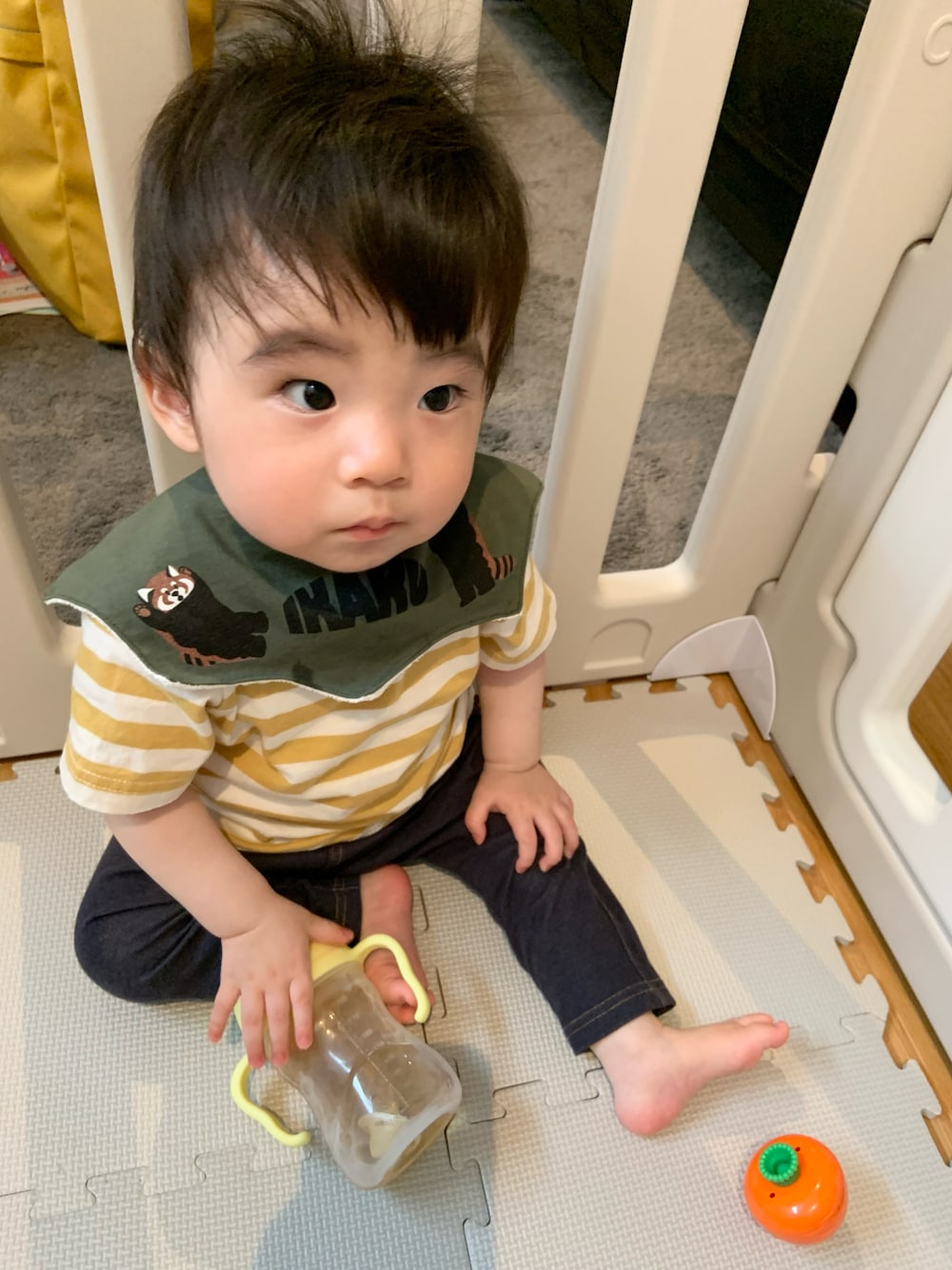 このスタイはレッサーパンダの威嚇ポーズがかわいくて気に入っています。よだれが多いのでスタイ必須なのですが、コーデ考えるの楽しい〜。