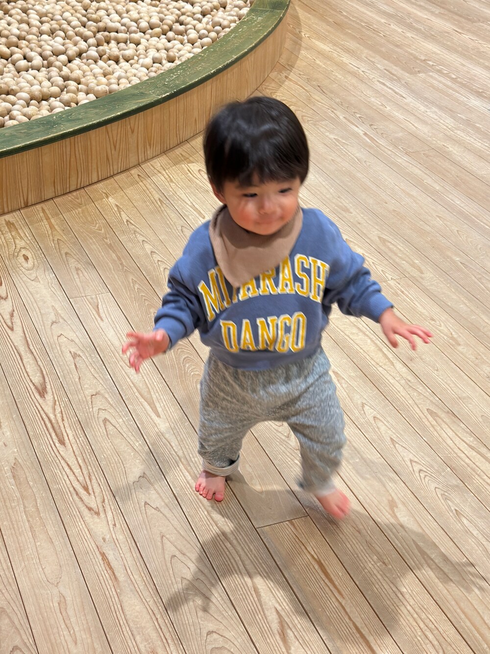 室内の遊び場へ。3歳未満の子どもの遊び場ってなかなか無いですね。 トレーナーはカレッジプリントと思いきや、ただのお菓子名のローマ字です。お茶目で可愛い〜!サイズはかなり小さめです。
