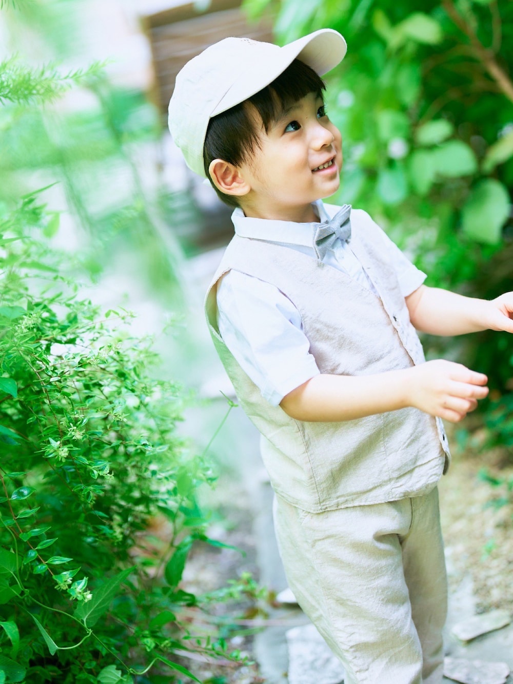 2歳のバースデイフォトを撮りました。1歳のときに使ったアイテムを再度着用。前はブカブカでしたが、ジャストサイズになってすっきり!服のサイズは90センチ、身長は87センチくらいです。