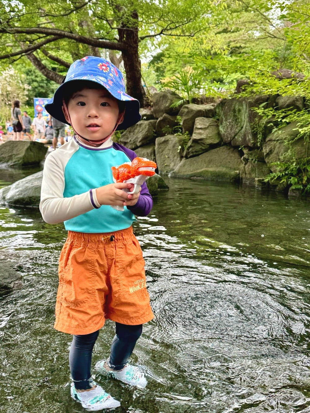 じゃぶじゃぶ池に行ってきました。転んでケガをするのが心配なので、膝が出ないようラッシュレギンスをはかせています。