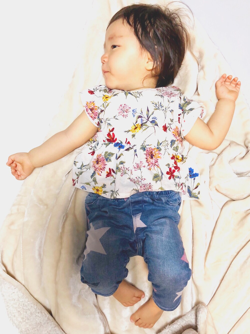 お昼寝から起きました♡放心状態、、、 トップスはサイズ80。着るのが少しきつい。上下セットなので下に合わせるとサイズ80になってしまったけど、、、90にすれば良かった。後悔。 ジーパンはサイズ80。丈はジャスト。来年は無理だろうな、、、。