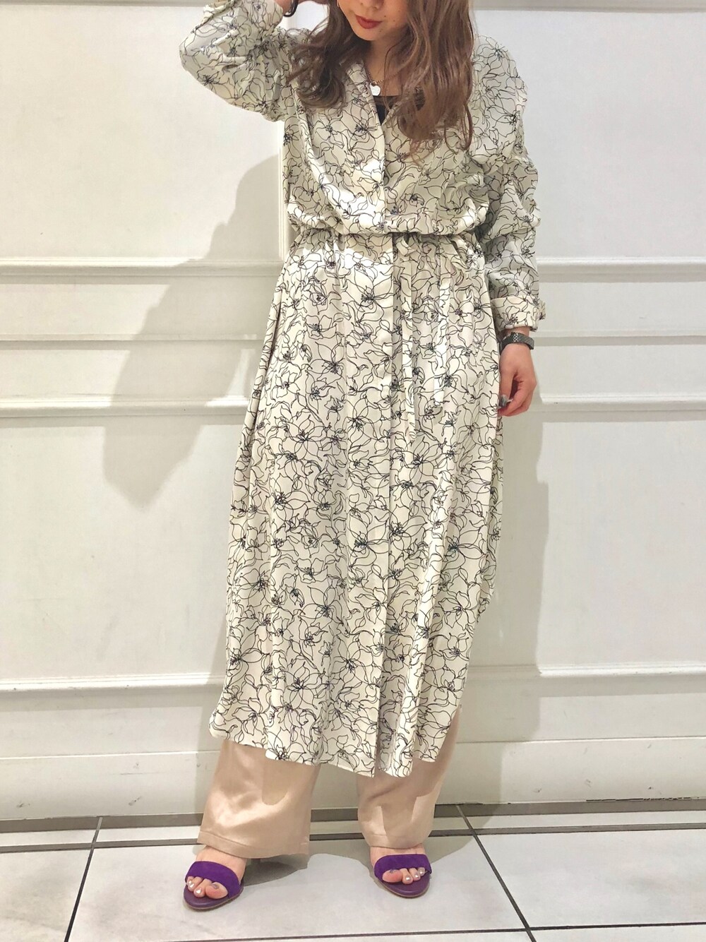 S A R A(ピシェ アバハウス ルクア大阪店)のワンピース「ドローイングフラワー開襟ワンピース」を使ったコーディネート
