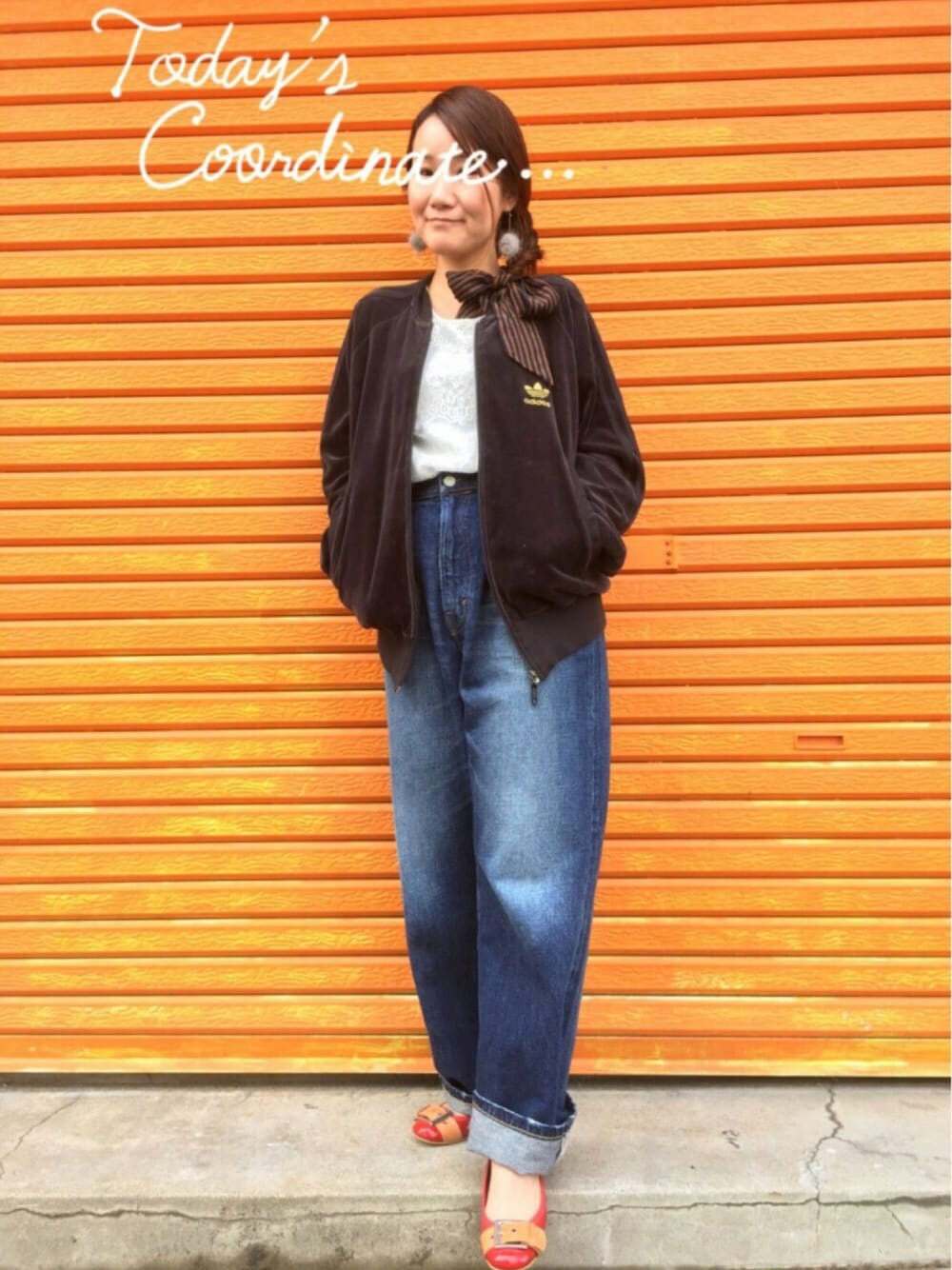 俗に言う 「甘辛ミックスコーデ」とでも言っておきましょうか😅 中は総レースのトップスをインしてます。 旦那さんのベロアジャージをお借りしました。 ゴールドのアディダス✨着心地良いし可愛い過ぎます♡