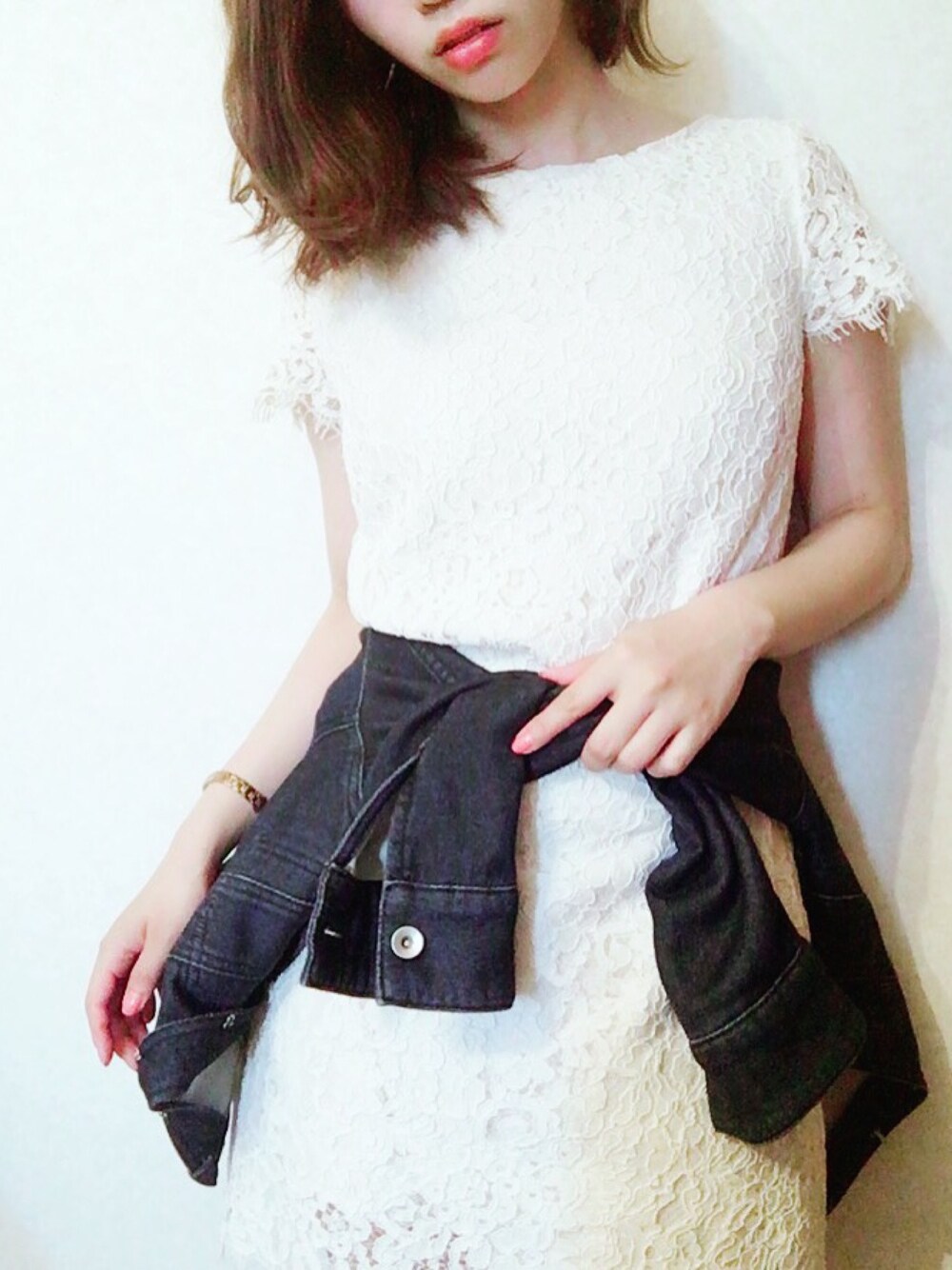 ドレッシーなレースワンピを、腰巻きデニムでカジュアルダウン。休日スタイルです🌴