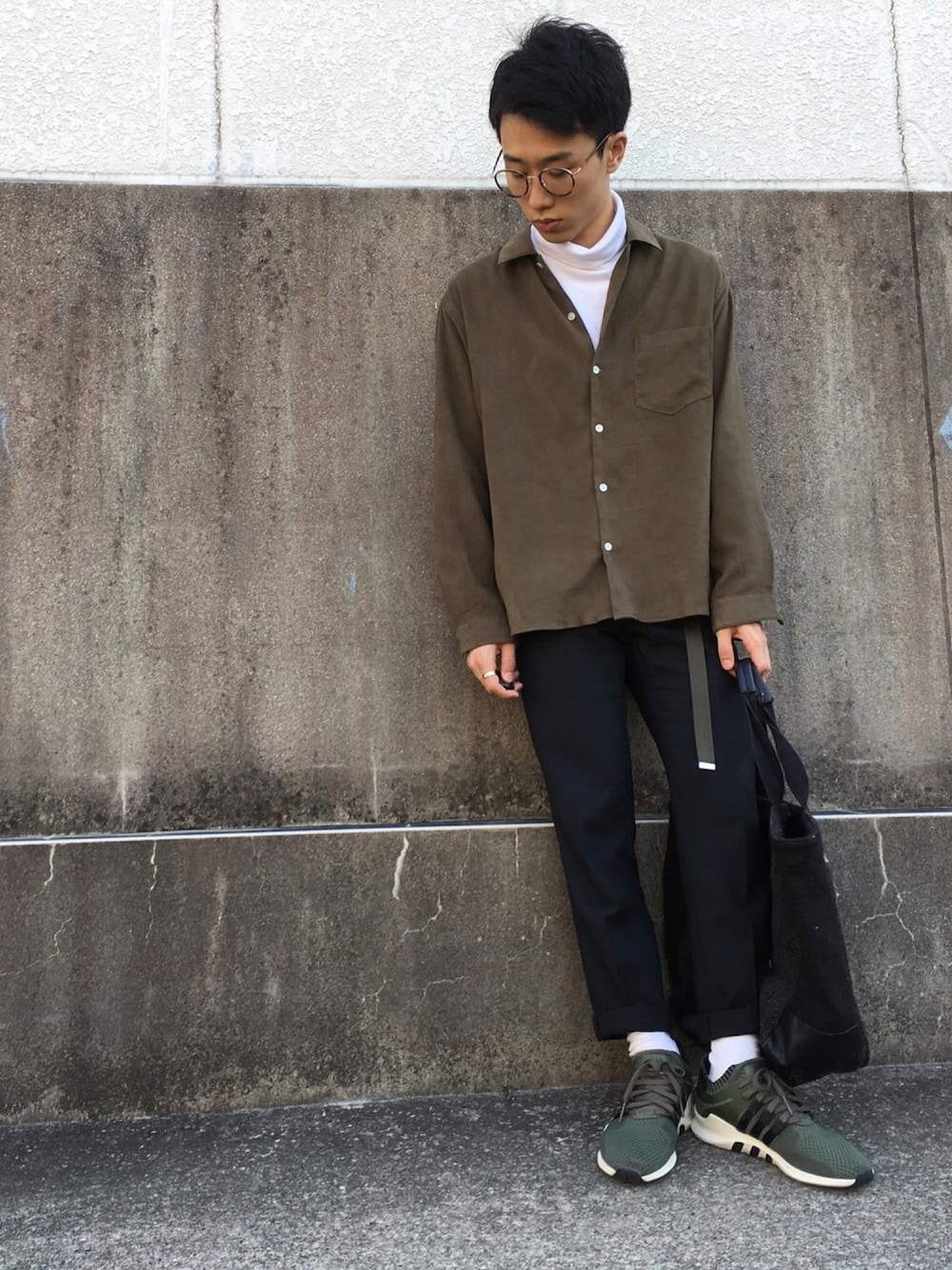 TPO 冬物を買いに行こうコーデ。 コートは秋のコーディネートの上に着れるから、そのまま合わせるとよいですね。 ポイント 少し野暮ったい色のフェイクスエードシャツがメイン。 野暮ったい印象を払拭するために、スラックスを合わせたり、首元と足元に白をはさむ。 シャツのシルエットがボックスでSサイズで少し大きめなので、そのままスキニースラックスでYラインにまとめる。 それだけではさみしいので、 電車メガネ トートバッグ ガチャベルト で装飾。 色数は増やさないように拾ってく。