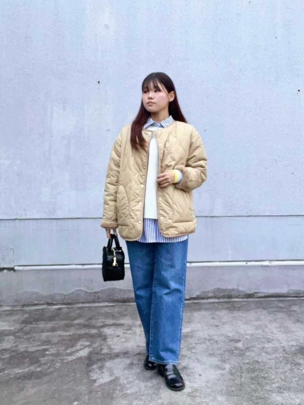 20代前半/156cm/骨格ウェーブ/普段サイズM/着用サイズトップス38ボトムス38 【ALリバーシブルキルティングブルゾン】 サイズ感:ゆったりしていて身幅にゆとりあり。ヒップにかかる丈感。 素材感:軽くて暖かい。キルティングとボアの素材。 着用感:リバーシブルで着回しできて冬から春先まで活躍してくれる◎色味も程よくカジュアルスタイルに合わせやすい。 【ネック刺繍クルーネックニット】 サイズ感:全体的にゆとりあり。 素材感:柔らかく肌触りのいいニット素材。 着用感:ネック部分の刺繍と袖口のカラーがさりげなくかわいいニットアイテム。 【レギュラーカラーオーバーシャツ】 サイズ感:ゆったり目なオーバーサイズ。 素材感:ポリエステル多めで柔らかい。 着用感:シンプルでき回しやすい◎羽織やレイヤードスタイル、1枚でも活躍するアイテム。 【オーセンティックストレートデニム】 サイズ感:ジャストサイズ。ロールアップしなくても足首までの丈感。 素材感:程よく厚みがあり、柔らかいデニム素材。 着用感:ロールアップをしても綺麗なシルエットで抜け感を。シンプルなデニムでたくさんの着こなしに活躍◎