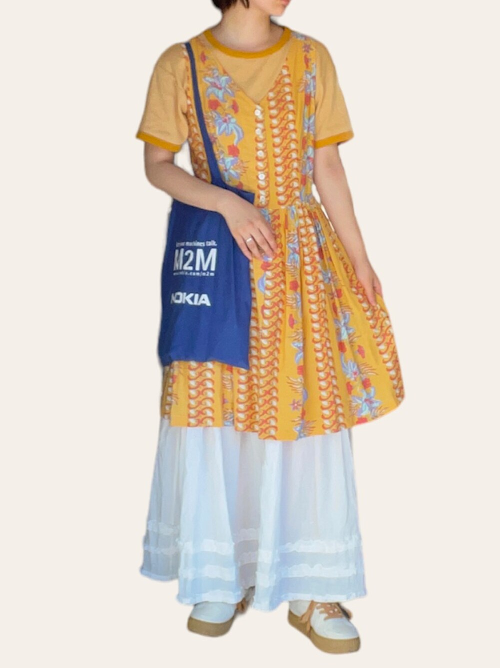 ショート丈のワンピースも、中にスカート履くとふわふわボリュームのあるロングワンピみたいになってめちゃ可愛い☺️ スニーカーは紐をソールの色に合わせて替えてみた🌼