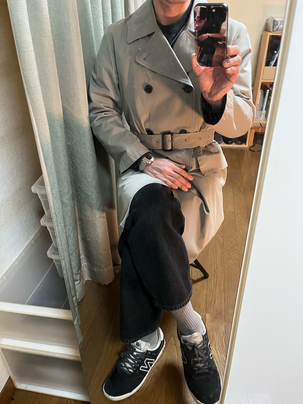 雰囲気あるコート。 デニムにスニーカーを合わせました。