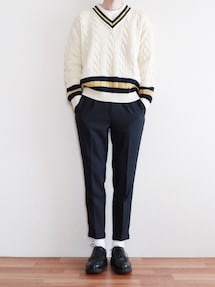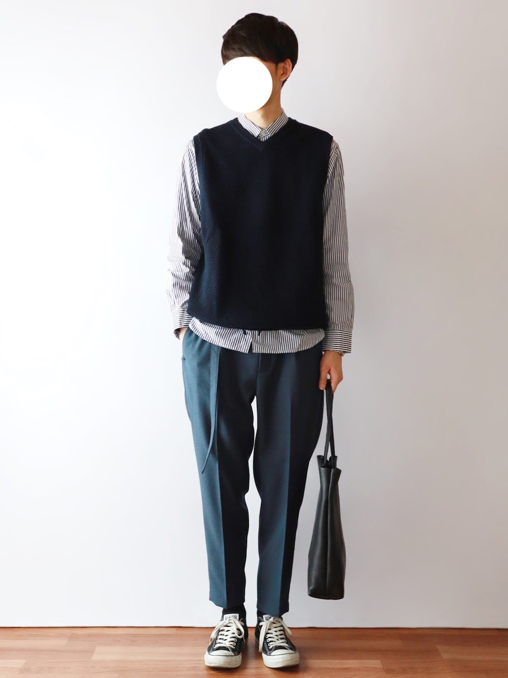 📷instagram → kitsune_w ネイビー×ストライプ 今年もニットベスト着ます🙋♂️ MR.OLIVEのパンツはシルエットと履き心地が本当に良いです🙆♂️ いつも見て頂きありがとうございます!