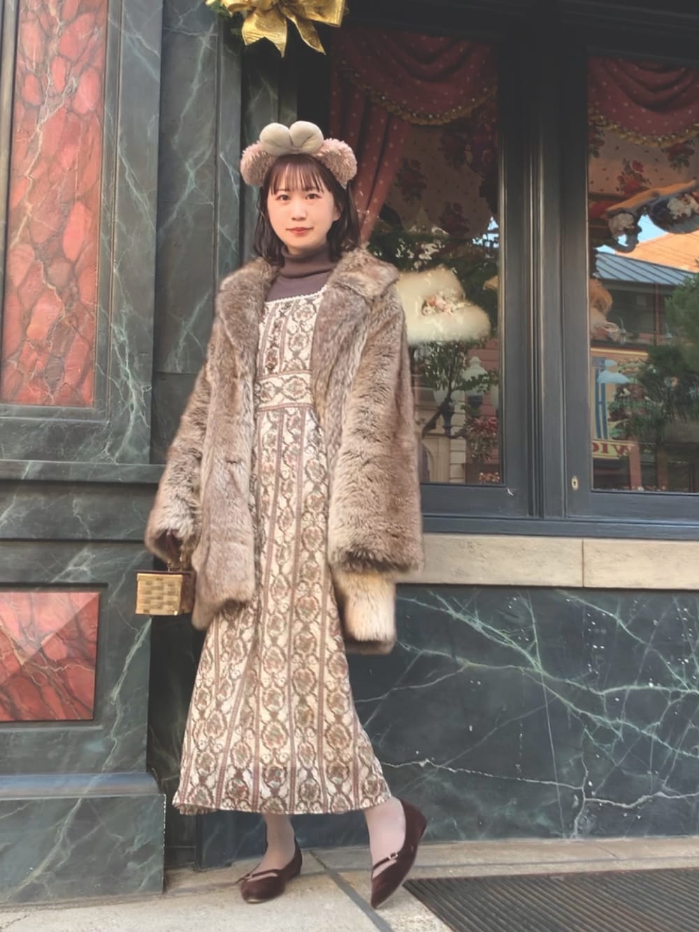 Christmas Disney coordinate 今更ですが11月のクリスマスディズニーのを🐭 ファーコートはmangataのものになります。 50'sのルーサイトバッグをもってゴテゴテのヴィンテージコーデにしました🦌
