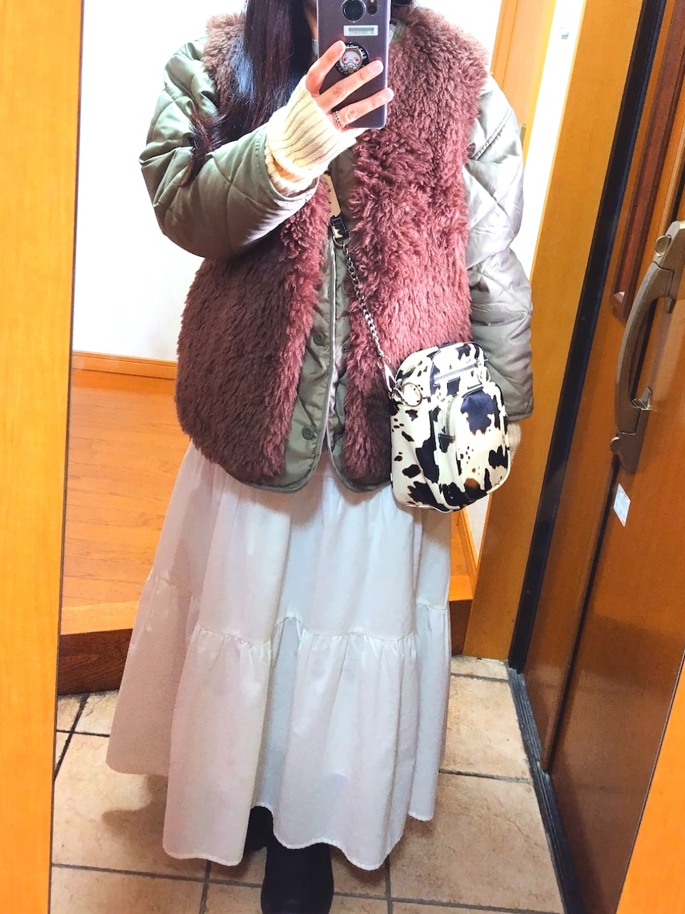 キルトコートに付属していたベストをmiteのファーベストに変えてみました。 お気に入りのコーデです😃💕