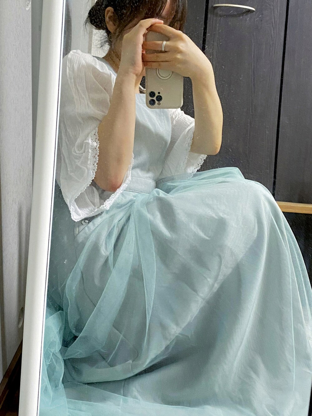 ご覧いただきありがとうございます🕊 チュールのスカートが可愛いジャンスカのワンピースです🤍🌨 グリーン寄りの水色がとっても可愛いです!! 丈の調節が出来るのですが限界まで引き上げないと床にスカートが付いてしまうので厚底を履いて着ていこうと思います🥰