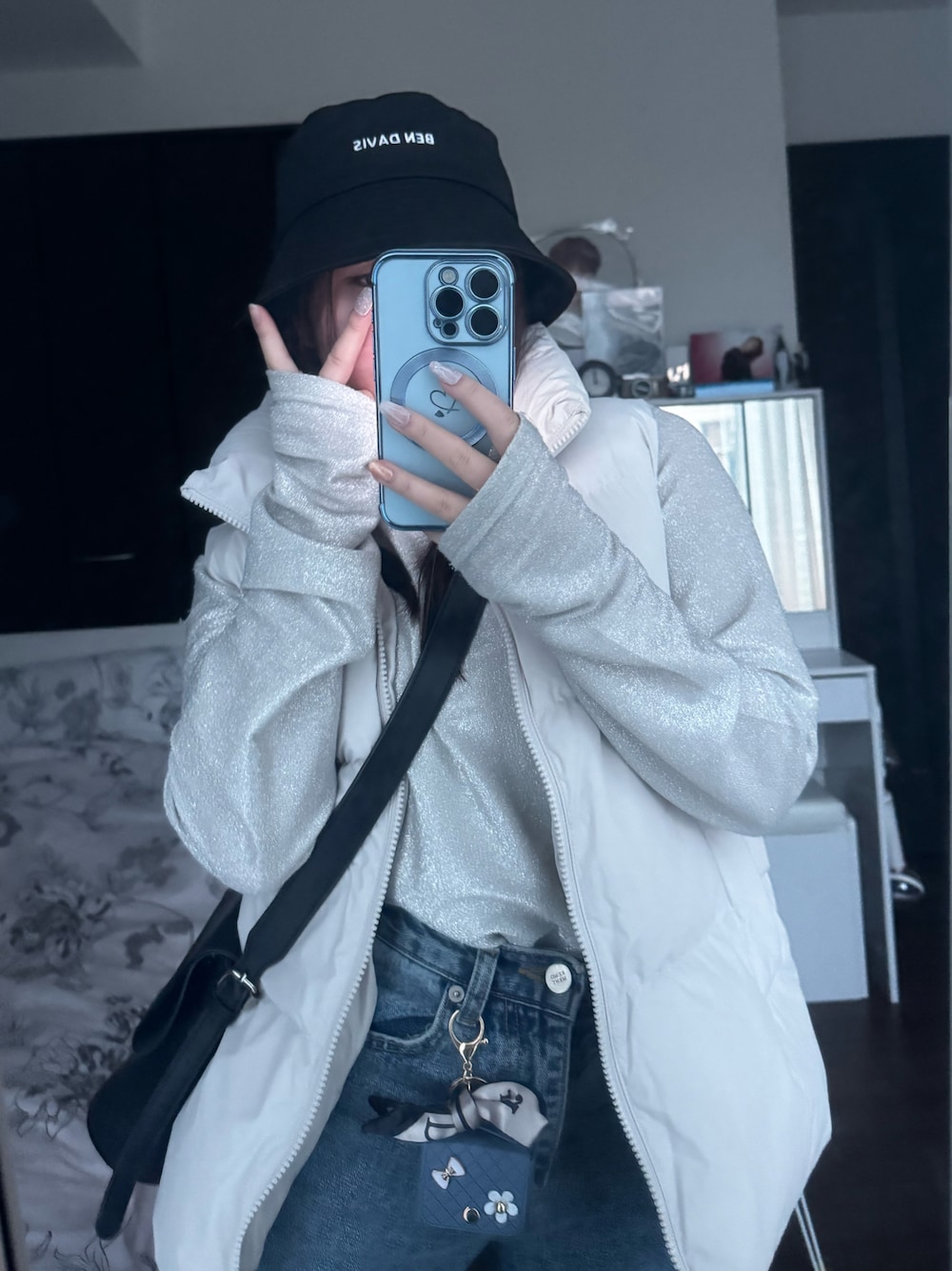 好きな服装なので久しぶりに投稿しました🪽 最近はこういう色味が大好きです🤍🫧 AirPodsケースに小さいスカーフ付いててかわいい🎀
