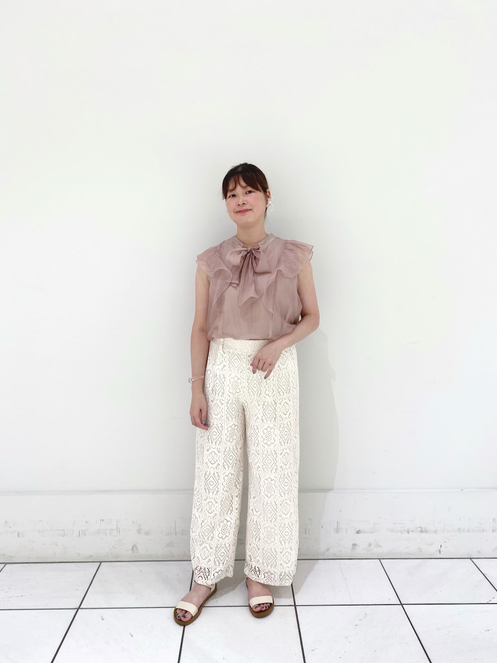 レースパンツは暑い日に穿くと裏地が足にくっついて酷暑には着られないので、 今日は雨で気温が低かったので着れました😊 ピンクのブラウスを合わせました🩷 いつもいいね!ありがとうございます!