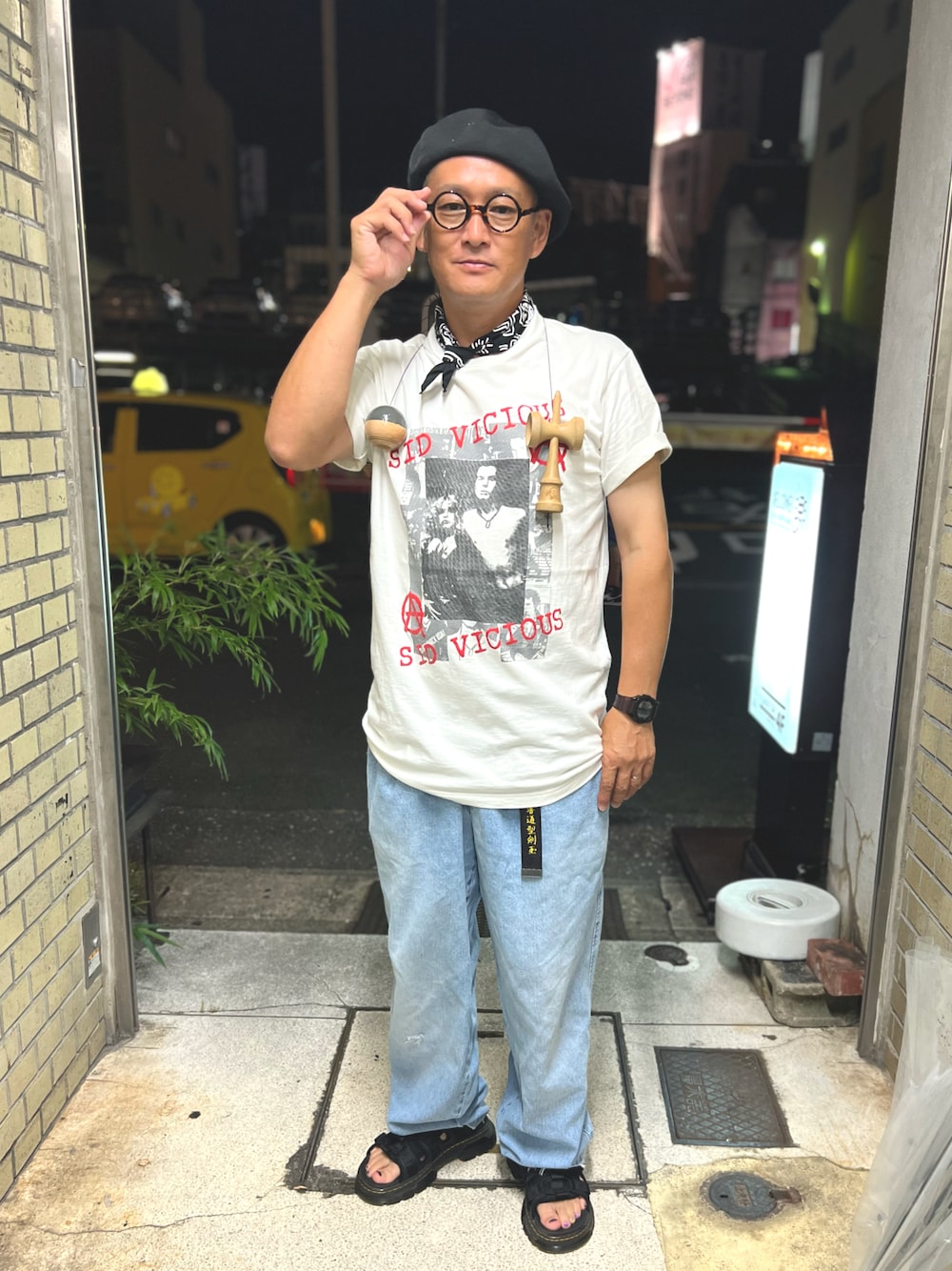 お気に入りのシドTシャツ&初めて首にバンダナ巻いてみた。ベルトが黒帯に見えたら嬉しい。