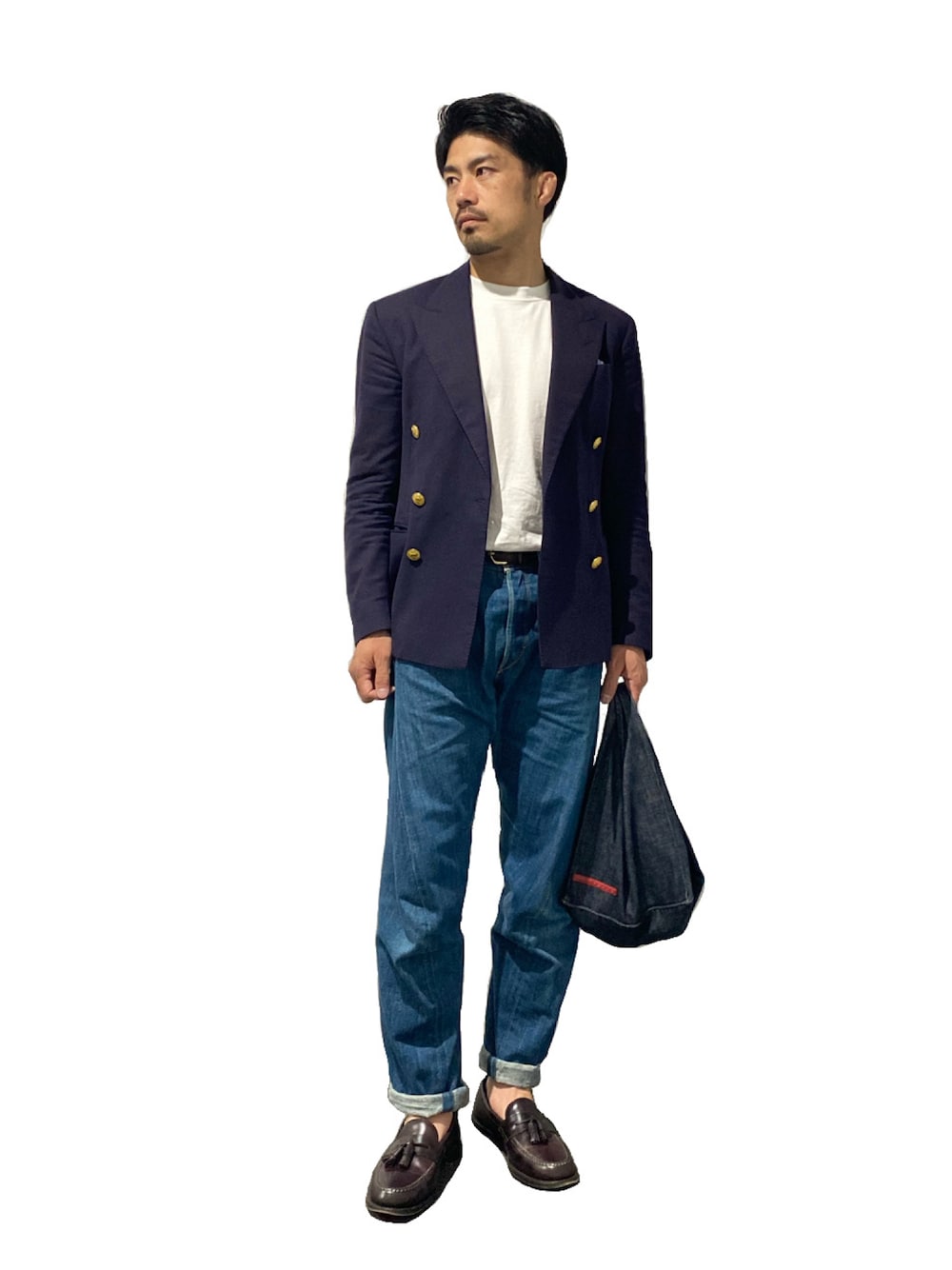 ダブルの紺ブレとデニム。 デニムは1999年発表のLevi's RED「1ST STANDARD」 リーバイスレッドの記念すべきファーストシリーズにして最高傑作だと思います。 ローファーはオールデン×ユナイテッドアローズB&Yの別注 革:コードバン 色:ダークバーガンディ 木型:バンラスト タッセルローファーには珍しいバンラストに惹かれて数年前に購入しました。