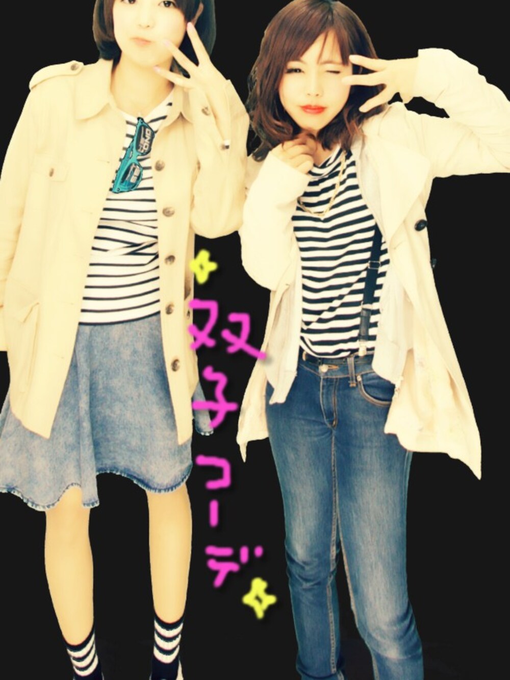 (右) トレンチコート、ボーダー柄トップス、 デニムで双子コーデをしてみたよ😇💟💟
