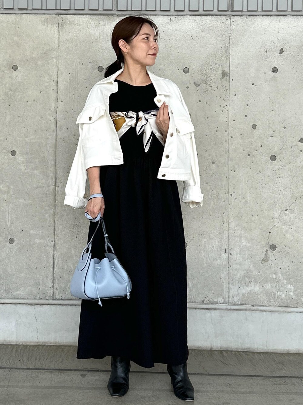 シンプルなワンピースにはスカーフでアクセント♪ 大判のスカーフをアレンジしたstylingです。 大胆な柄がオススメです!