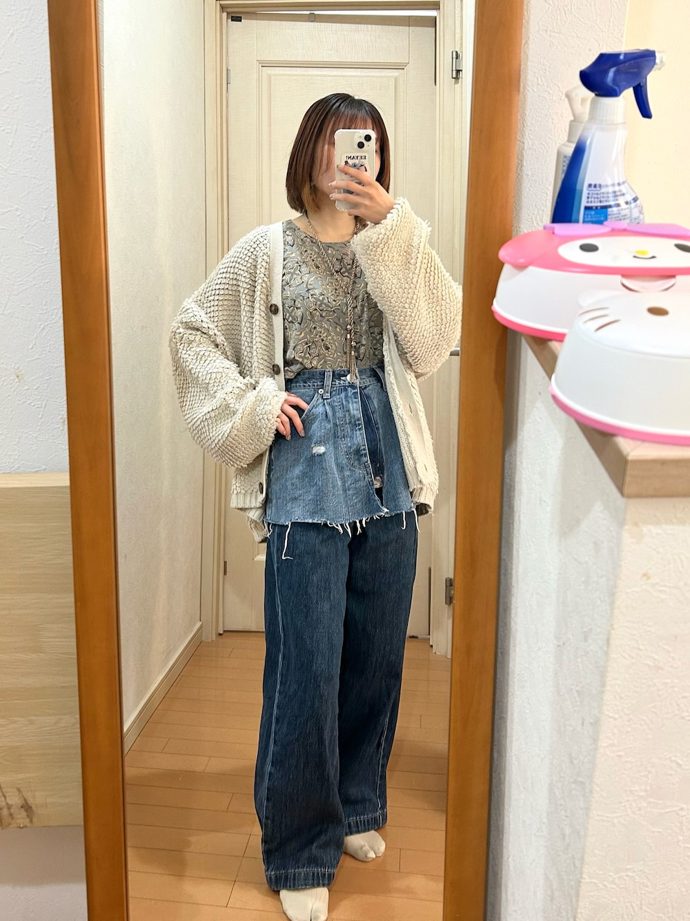 こことのデニムパンツ「【高身長・大きいサイズ対応/5サイズ展開】美脚見え×ラフさのいいとこ取り♪ハイウエスト ルーズ デニム パンツ」を使ったコーディネート