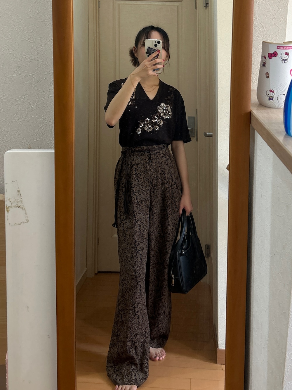 ブラウン系のトップス、ブラウン系のパンツを着用したレディースの秋コーディネートの1枚目の写真