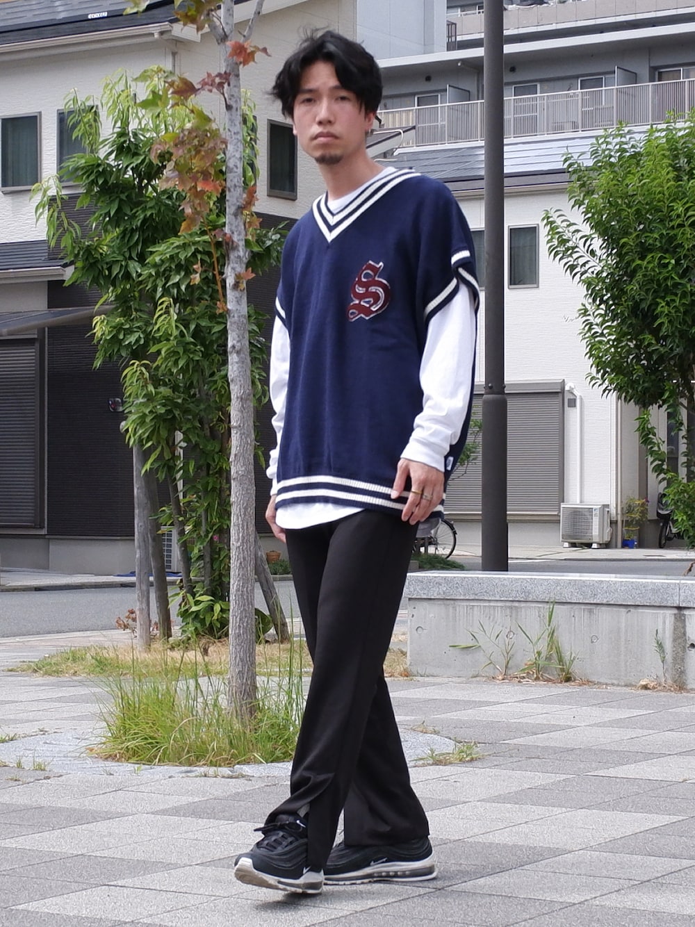 かみけん。のベスト「オーバーサイズ サガラ刺繍ワッペン ニットベスト【ILL'S】」を使ったコーディネート