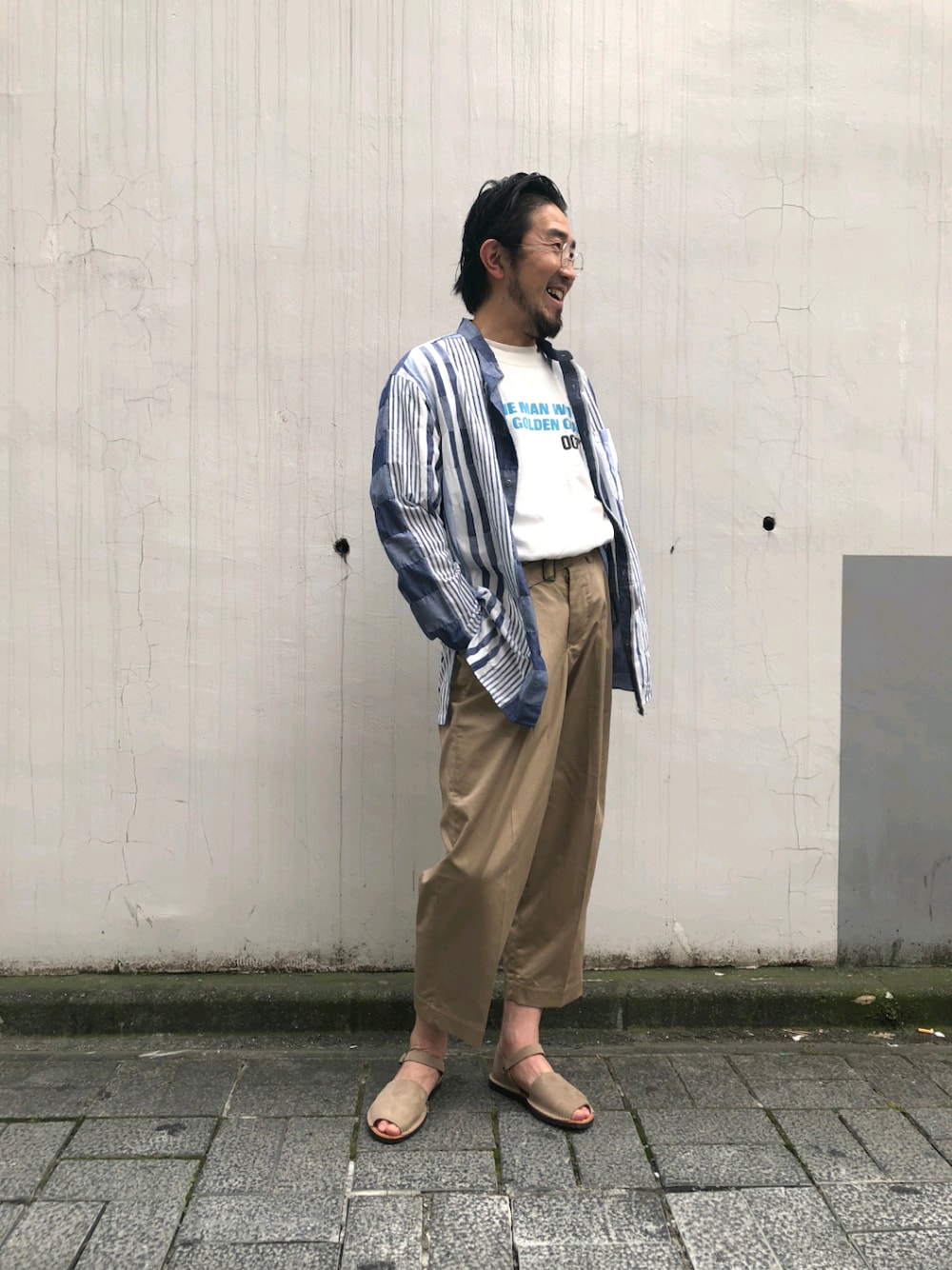 コーディネートのポイントはハバーサックの太めパンツを履いてのリラックススタイル。 着用しているシャツはサージュデクレのssシャツ! ディレクターは千田仁寿が、〈DEZART〉を経て2001年より始めた。サージュデクレは、「賢明な」を意味する仏語の「sage(サージュ)」と「布告」という意味の「decret(デクレ)」を掛け合わせた造語。ブランドの基本概念としてワーク、ミリタリー、トラディショナルこそメンズウエアのベースのアイテムが中心! 今回はお気に入りのシャツをコーディネートしました! チェックして見て下さい!!