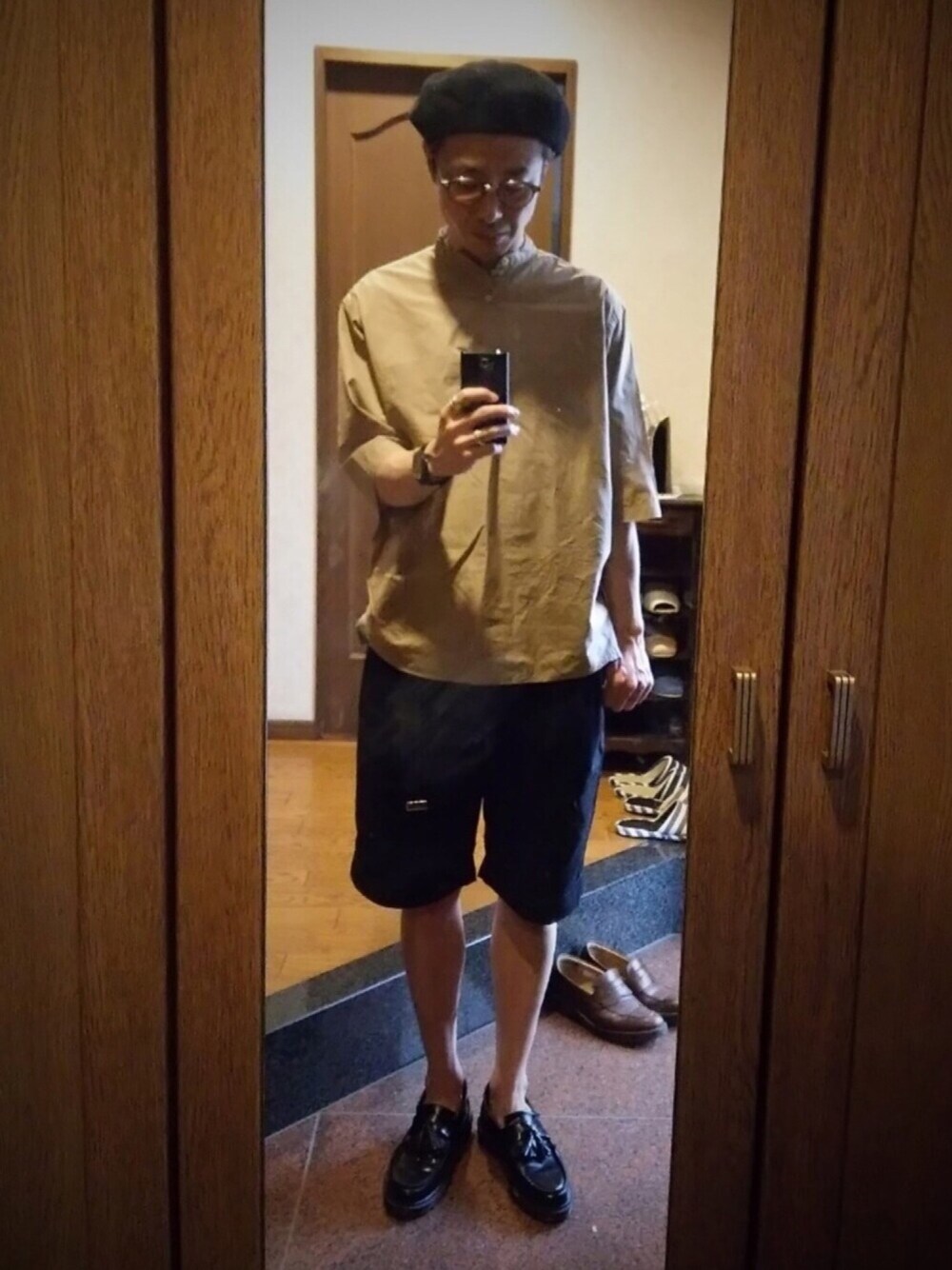 ベージュの五分袖タイプライターシャツ。雰囲気、色ともに◎